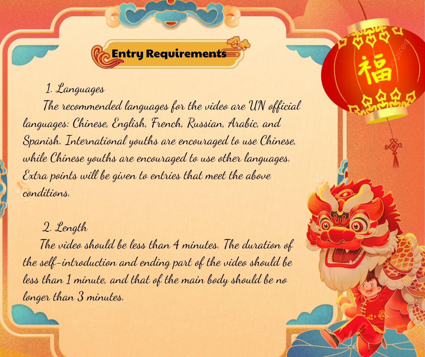 The recommended languages for the video are UN official languages: Chinese, English, French, Russian, Arabic, and Spanish. International youths are encouraged to use Chinese, while Chinese youths are encouraged to use other languages. Extra points will be given to entries that meet the above conditions.