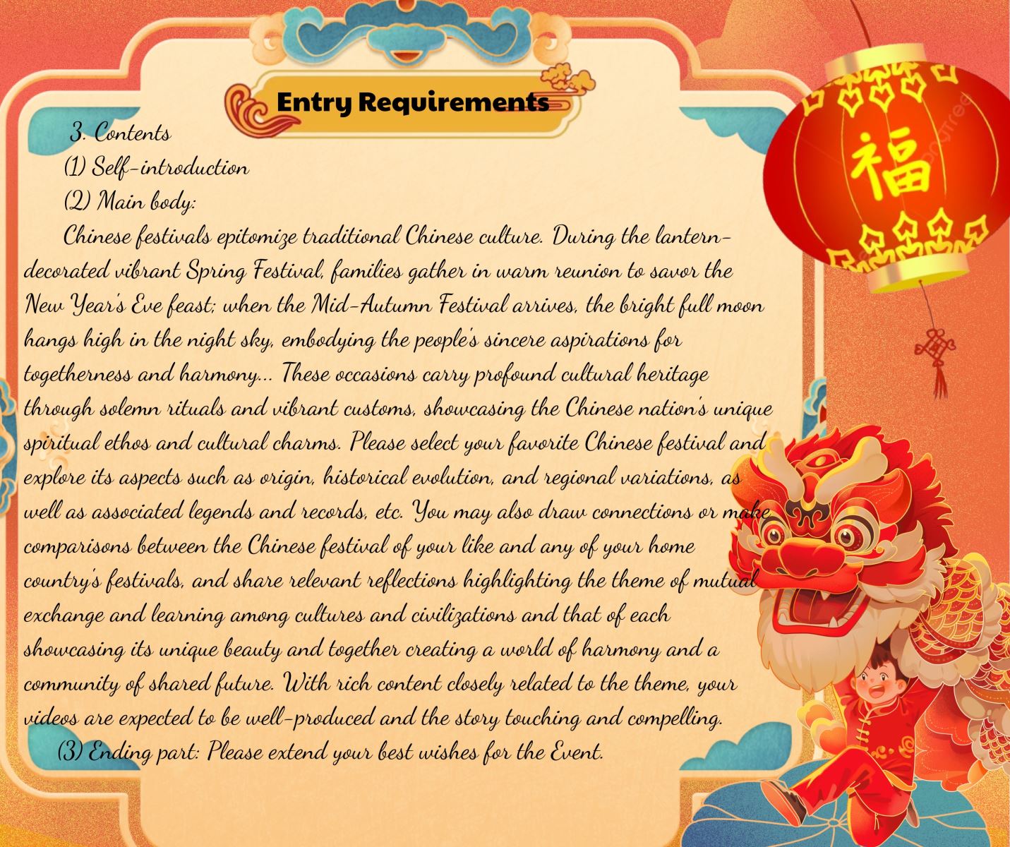Chinese festivals epitomize traditional Chinese culture. During the lantern-decorated vibrant Spring Festival, families gather in warm reunion to savor the New Year's Eve feast; when the Mid-Autumn Festival arrives, the bright full moon hangs high in the night sky, embodying the people's sincere aspirations for togetherness and harmony... These occasions carry profound cultural heritage through solemn rituals and vibrant customs, showcasing the Chinese nation's unique spiritual ethos and cultural charms. Please select your favorite Chinese festival and explore its aspects such as origin, historical evolution, and regional variations, as well as associated legends and records, etc. You may also draw connections or make comparisons between the Chinese festival of your like and any of your home country's festivals, and share relevant reflections highlighting the theme of mutual exchange and learning among cultures and civilizations and that of each showcasing its unique beauty and together creating a world of harmony and a community of shared future. With rich content closely related to the theme, your videos are expected to be well-produced and the story touching and compelling.