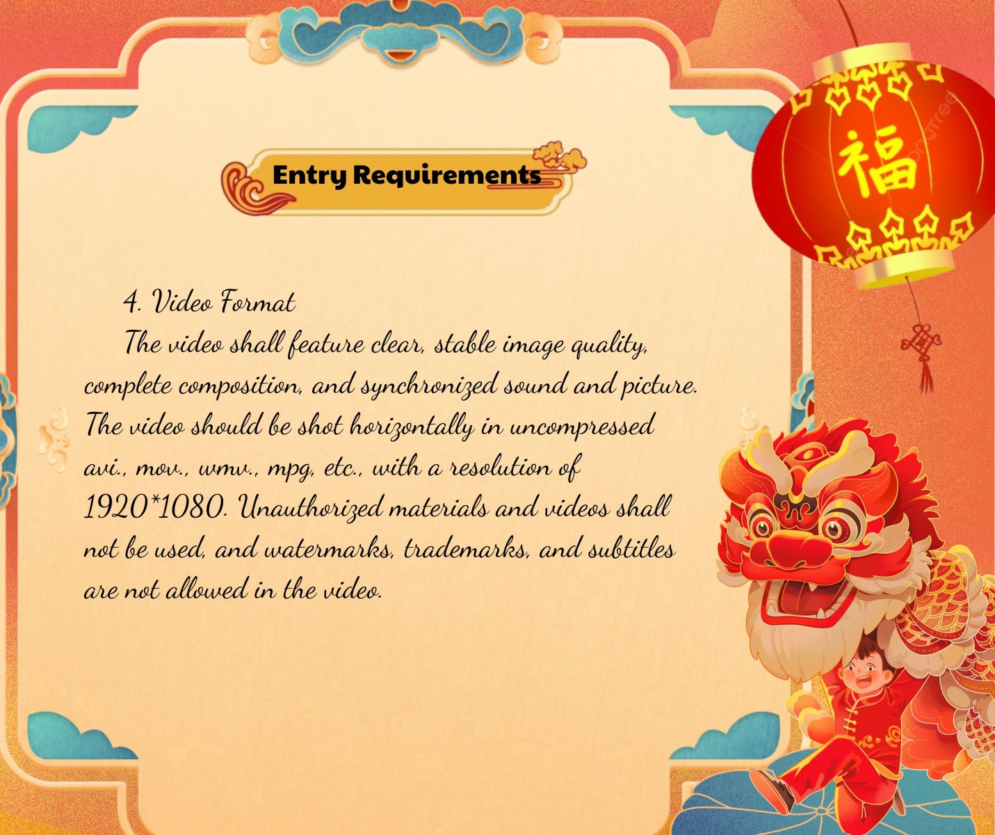 The video shall feature clear, stable image quality, complete composition, and synchronized sound and picture. The video should be shot horizontally in uncompressed avi., mov., wmv., mpg, etc., with a resolution of 1920*1080. Unauthorized materials and videos shall not be used, and watermarks, trademarks, and subtitles are not allowed in the video.