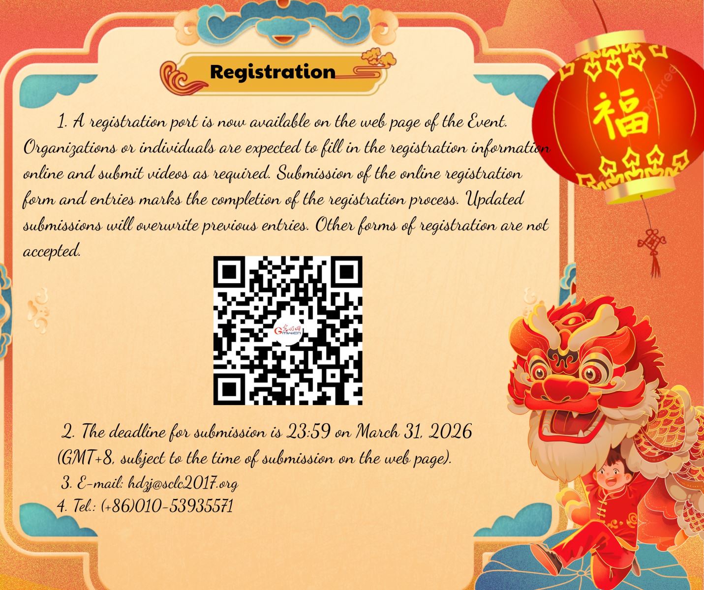 1. A registration port is now available on the web page of the Event. Organizations or individuals are expected to fill in the registration information online and submit videos as required. Submission of the online registration form and entries marks the completion of the registration process. Updated submissions will overwrite previous entries. Other forms of registration are not accepted.