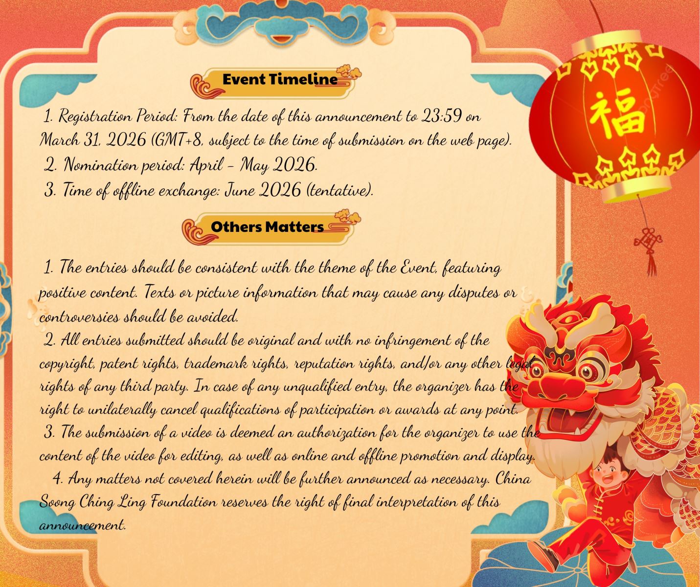 4. Any matters not covered herein will be further announced as necessary. China Soong Ching Ling Foundation reserves the right of final interpretation of this announcement.