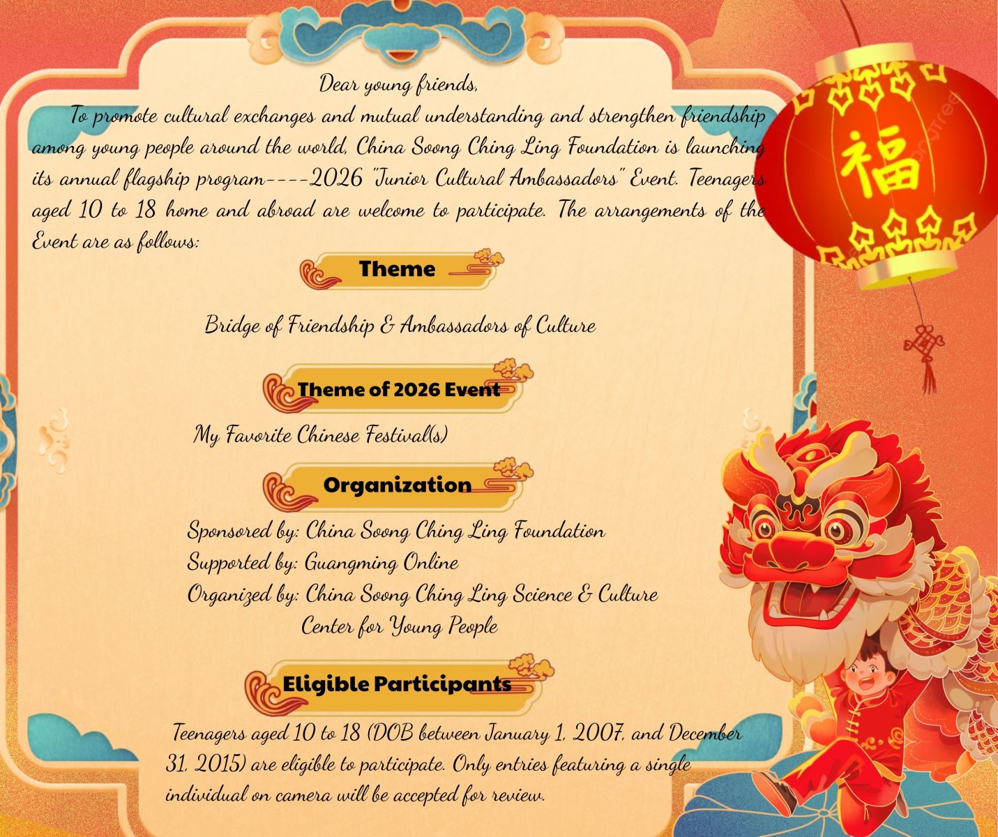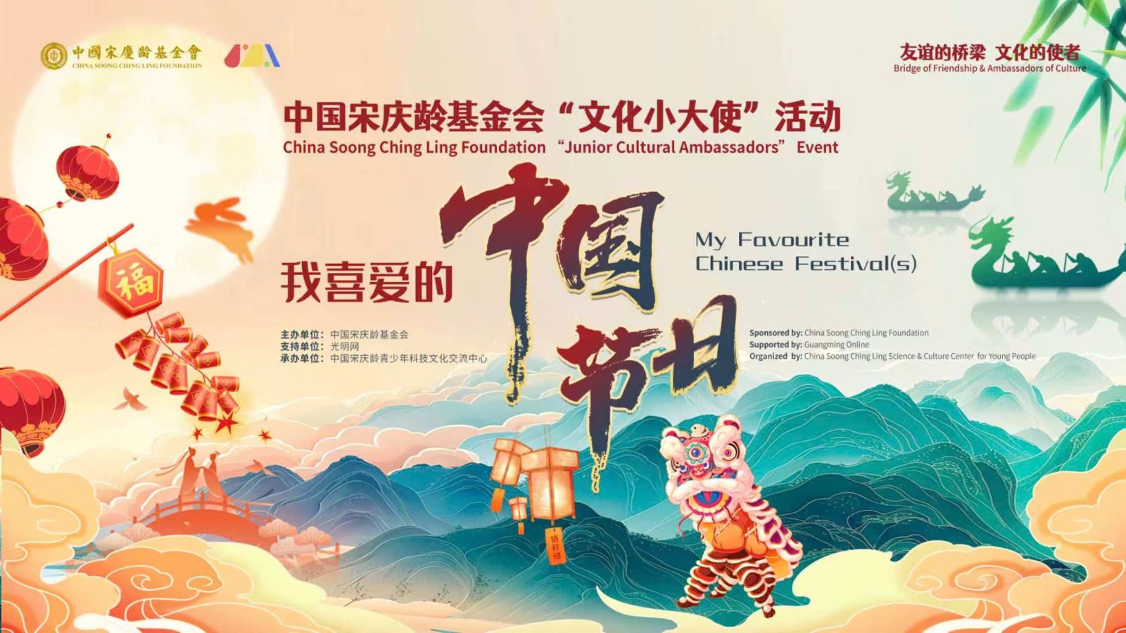 To promote cultural exchanges and mutual understanding and strengthen friendship among young people around the world, China Soong Ching Ling Foundation is launching its annual flagship program----2026 "Junior Cultural Ambassadors" Event. Teenagers aged 10 to 18 home and abroad are welcome to participate. The arrangements of the Event are as follows: