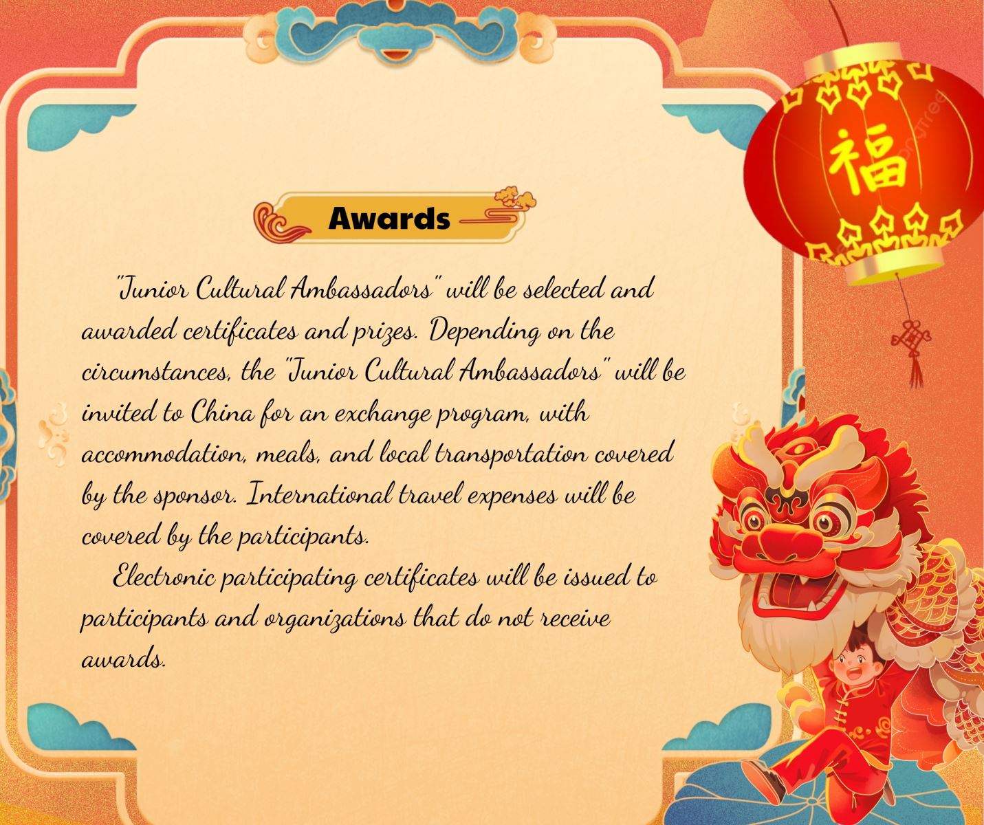 "Junior Cultural Ambassadors" will be selected and awarded certificates and prizes. Depending on the circumstances, the "Junior Cultural Ambassadors" will be invited to China for an exchange program, with accommodation, meals, and local transportation covered by the sponsor. International travel expenses will be covered by the participants.