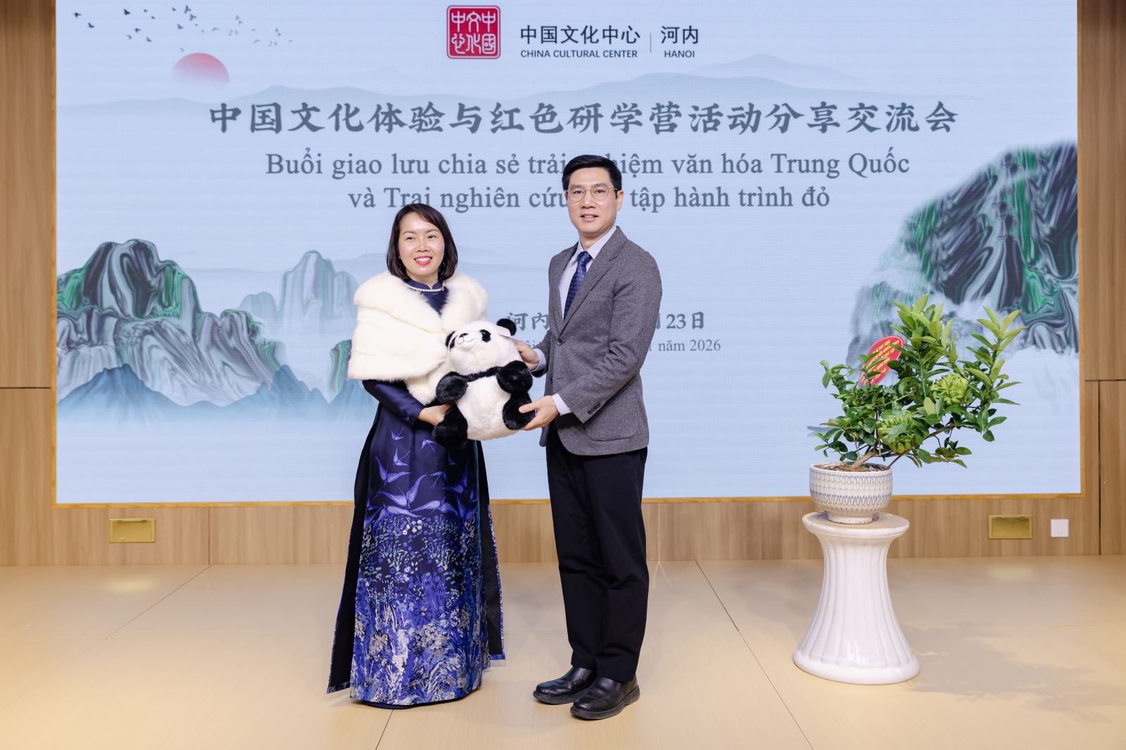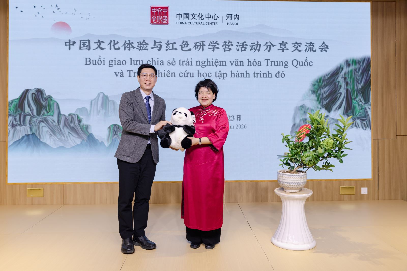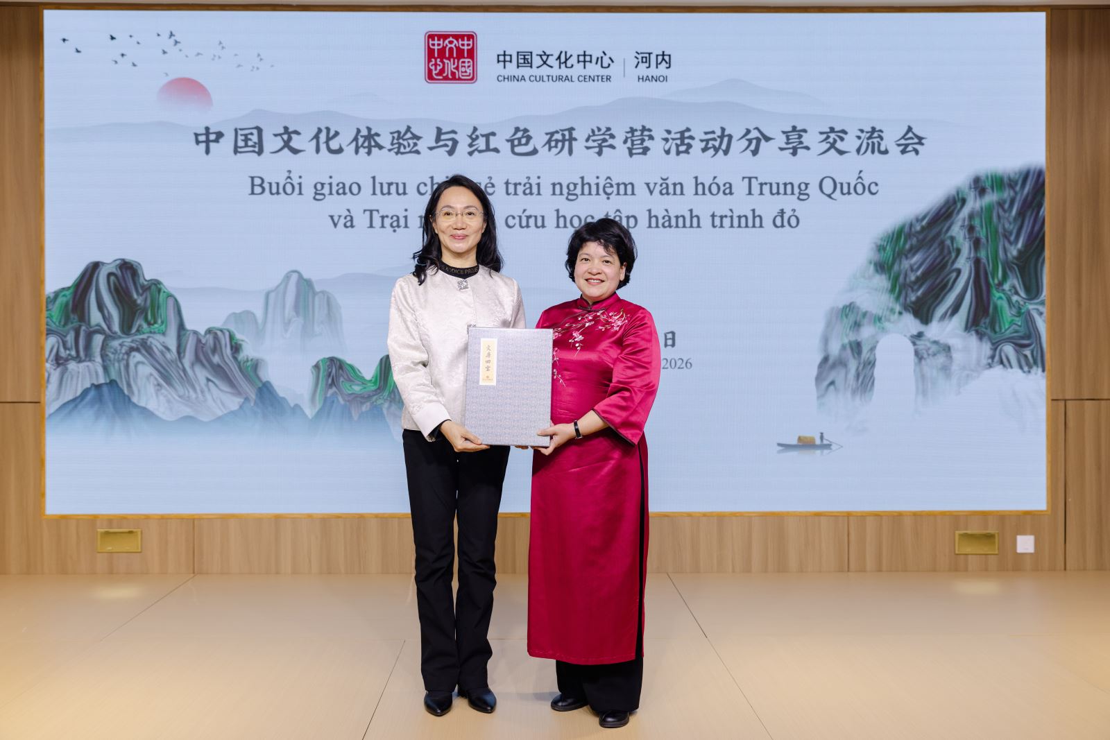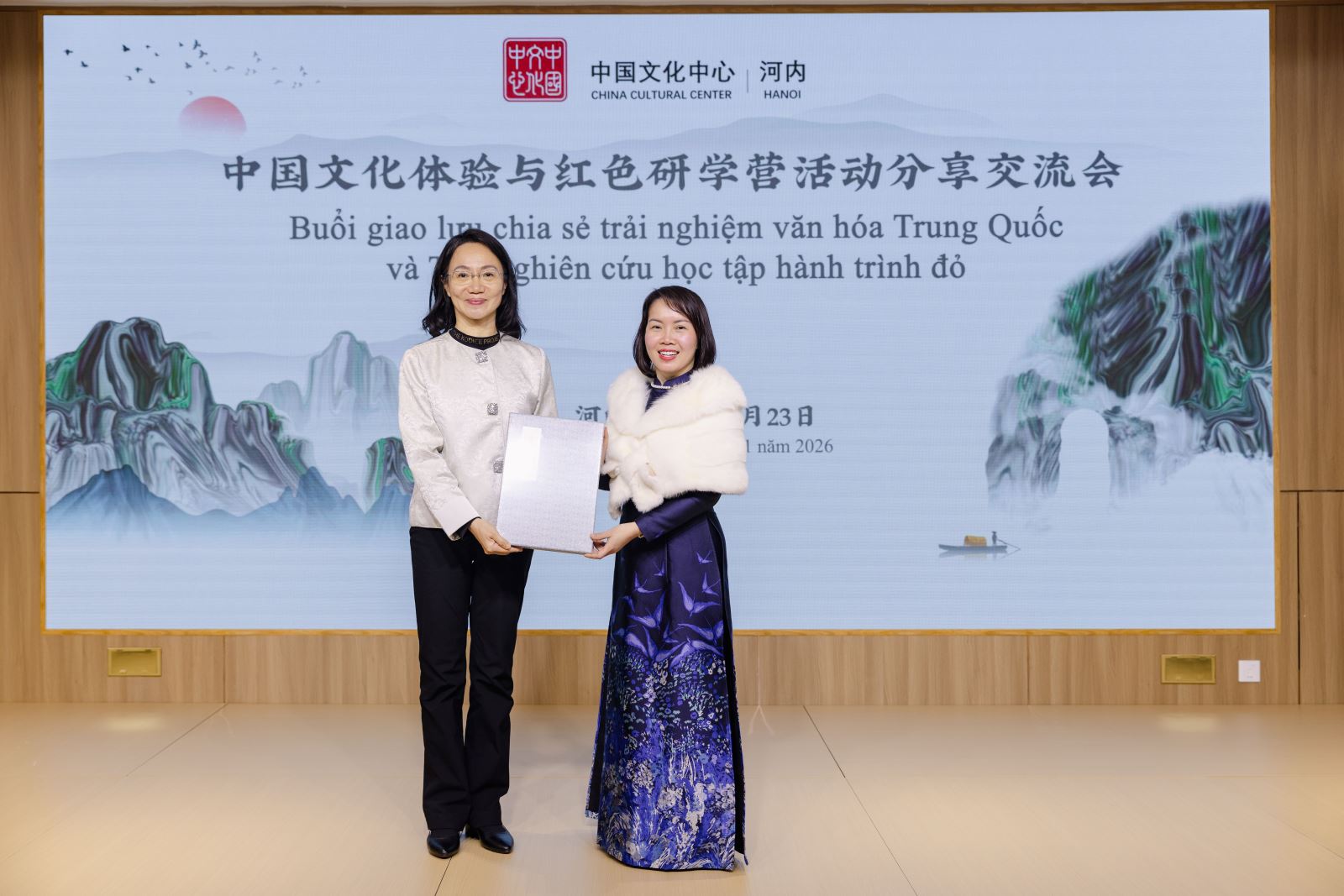 Chiều ngày 23/1, dưới sự chỉ đạo và hỗ trợ của Đại sứ quán Trung Quốc tại Việt Nam, “Buổi giao lưu, chia sẻ về trải nghiệm văn hóa Trung Quốc và Trại nghiên cứu học tập hành trình đỏ” đã được tổ chức thành công tại Trung tâm Văn hóa Trung Quốc tại Hà Nội. Tham dự chương trình có Phu nhân Đại sứ Trung Quốc tại Việt Nam bà Tôn Sướng; Tham tán Đại sứ quán Trung Quốc tại Việt Nam ông Hình Cửu Cường, ông La Diệu Quang; Bí thư thứ nhất ông Vương Đình Quán; Giám đốc Trung tâm Văn hóa Trung Quốc tại Hà Nội ông Trương Đức Sơn; Hiệu trưởng Trường THPT Hà Nội – Amsterdam cô Trần Thùy Dương; Phó Hiệu trưởng Trường THPT chuyên Ngoại ngữ trực thuộc Đại học Quốc gia Hà Nội cô Đỗ Thị Ngọc Chi; cùng đại diện thầy cô, học sinh của hai trường THPT trọng điểm tại Hà Nội, và gần 100 lưu học sinh Trung Quốc đến từ Đại học Phúc Đán, Đại học Ngoại ngữ Bắc Kinh, Đại học Ngoại ngữ Ngoại thương Quảng Đông, Đại học Ngoại ngữ Tứ Xuyên và Đại học Hà Nội.