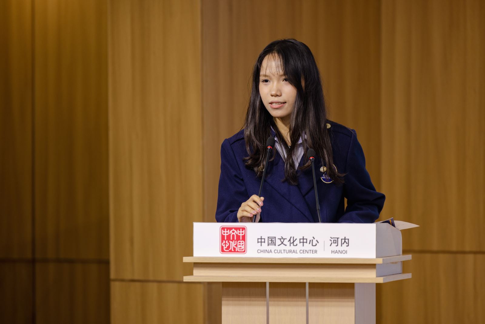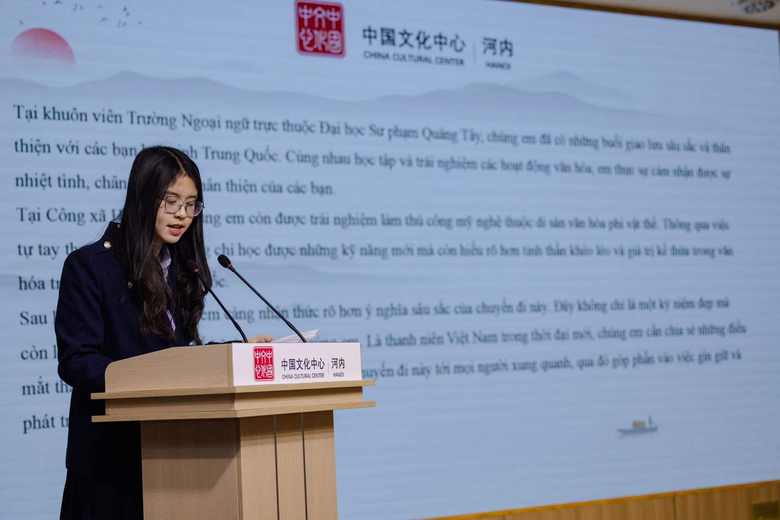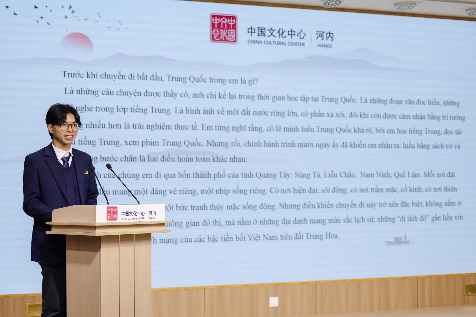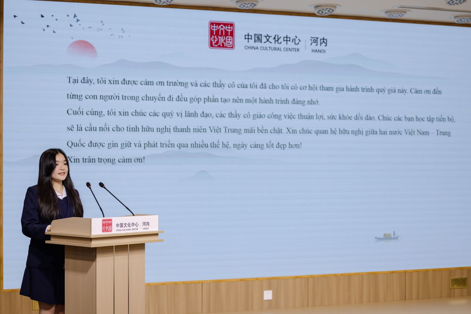 Chiều ngày 23/1, dưới sự chỉ đạo và hỗ trợ của Đại sứ quán Trung Quốc tại Việt Nam, “Buổi giao lưu, chia sẻ về trải nghiệm văn hóa Trung Quốc và Trại nghiên cứu học tập hành trình đỏ” đã được tổ chức thành công tại Trung tâm Văn hóa Trung Quốc tại Hà Nội. Tham dự chương trình có Phu nhân Đại sứ Trung Quốc tại Việt Nam bà Tôn Sướng; Tham tán Đại sứ quán Trung Quốc tại Việt Nam ông Hình Cửu Cường, ông La Diệu Quang; Bí thư thứ nhất ông Vương Đình Quán; Giám đốc Trung tâm Văn hóa Trung Quốc tại Hà Nội ông Trương Đức Sơn; Hiệu trưởng Trường THPT Hà Nội – Amsterdam cô Trần Thùy Dương; Phó Hiệu trưởng Trường THPT chuyên Ngoại ngữ trực thuộc Đại học Quốc gia Hà Nội cô Đỗ Thị Ngọc Chi; cùng đại diện thầy cô, học sinh của hai trường THPT trọng điểm tại Hà Nội, và gần 100 lưu học sinh Trung Quốc đến từ Đại học Phúc Đán, Đại học Ngoại ngữ Bắc Kinh, Đại học Ngoại ngữ Ngoại thương Quảng Đông, Đại học Ngoại ngữ Tứ Xuyên và Đại học Hà Nội.
