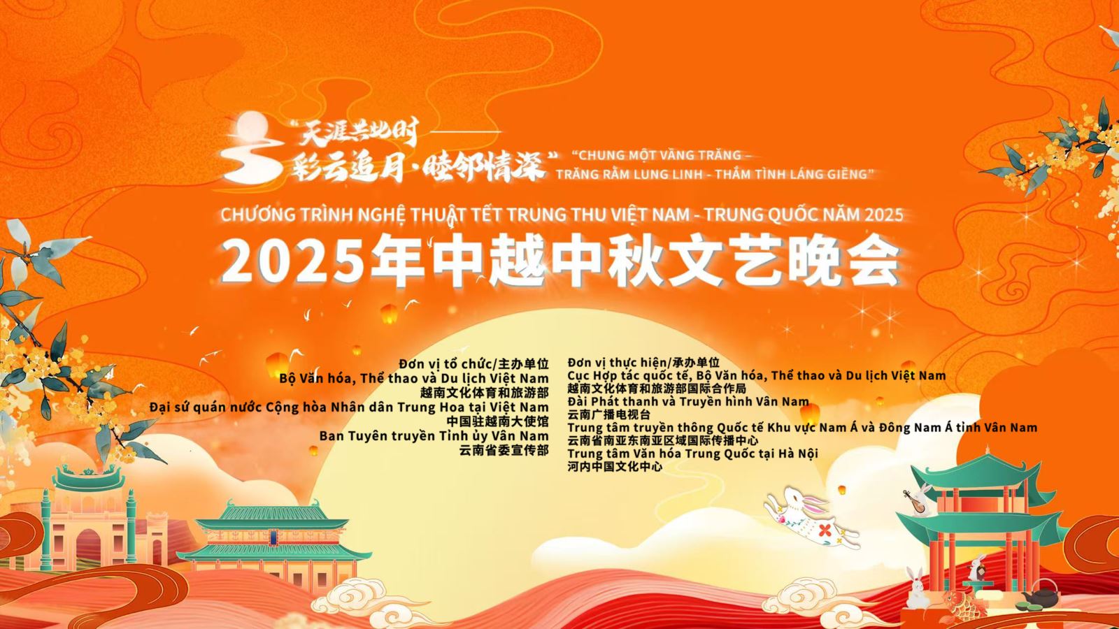中越携手共明月,文化交流谱新篇。2025年9月25日晚,由中国驻越南大使馆、越南文化体育和旅游部、中共云南省委宣传部共同主办,云南广播电视台、云南省南亚东南亚区域国际传播中心、河内中国文化中心以及越南文化体育和旅游部国际合作局联合承办的“天涯共此时——彩云追月·睦邻情深”2025年中越中秋文艺晚会在越南国家歌舞剧院隆重举行。本次晚会是中越建交75周年暨“中越人文交流年”的重要活动之一,以中秋团圆佳节为纽带,深度融合两国传统文化与现代艺术,成为一场彰显睦邻友好、促进文明互鉴的文化盛事。