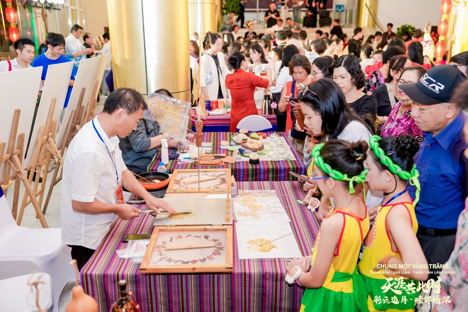 晚会开始前,一场以“月下市集—虚拟丽江古城风情”为主题的中秋游园活动率先点燃现场气氛。市集汇聚地道滇味与手作雅趣:云南鲜花饼酥皮泛香,云腿月饼油润咸香,石屏豆腐干嚼劲十足,普洱玫瑰凤梨酥则融茶韵与果酸于一体,猫哆哩等特色零嘴吸引不少观众驻足品尝。手作摊位前,糖画师傅腕转糖落、糖菓子师傅刀落形现、剪纸艺人巧手翻飞、小灯笼摊前暖光摇曳......精湛的手工技艺引得围观众人连连称赞。一旁的云南风景图片展则以影像为窗,将苍山洱海、梯田古城尽收眼底,引得观众凝神端详,仿佛身临其境。整场市集香气缭绕,在热闹喧嚣中交织出一幅融合传统与风情、味觉与视觉的中秋欢聚图景。