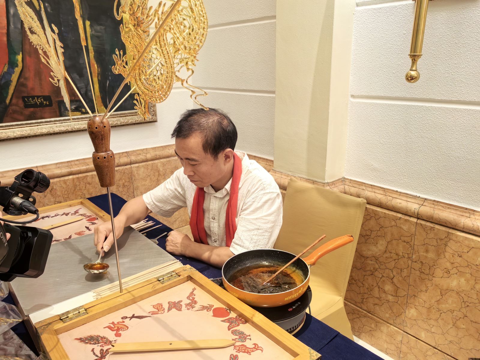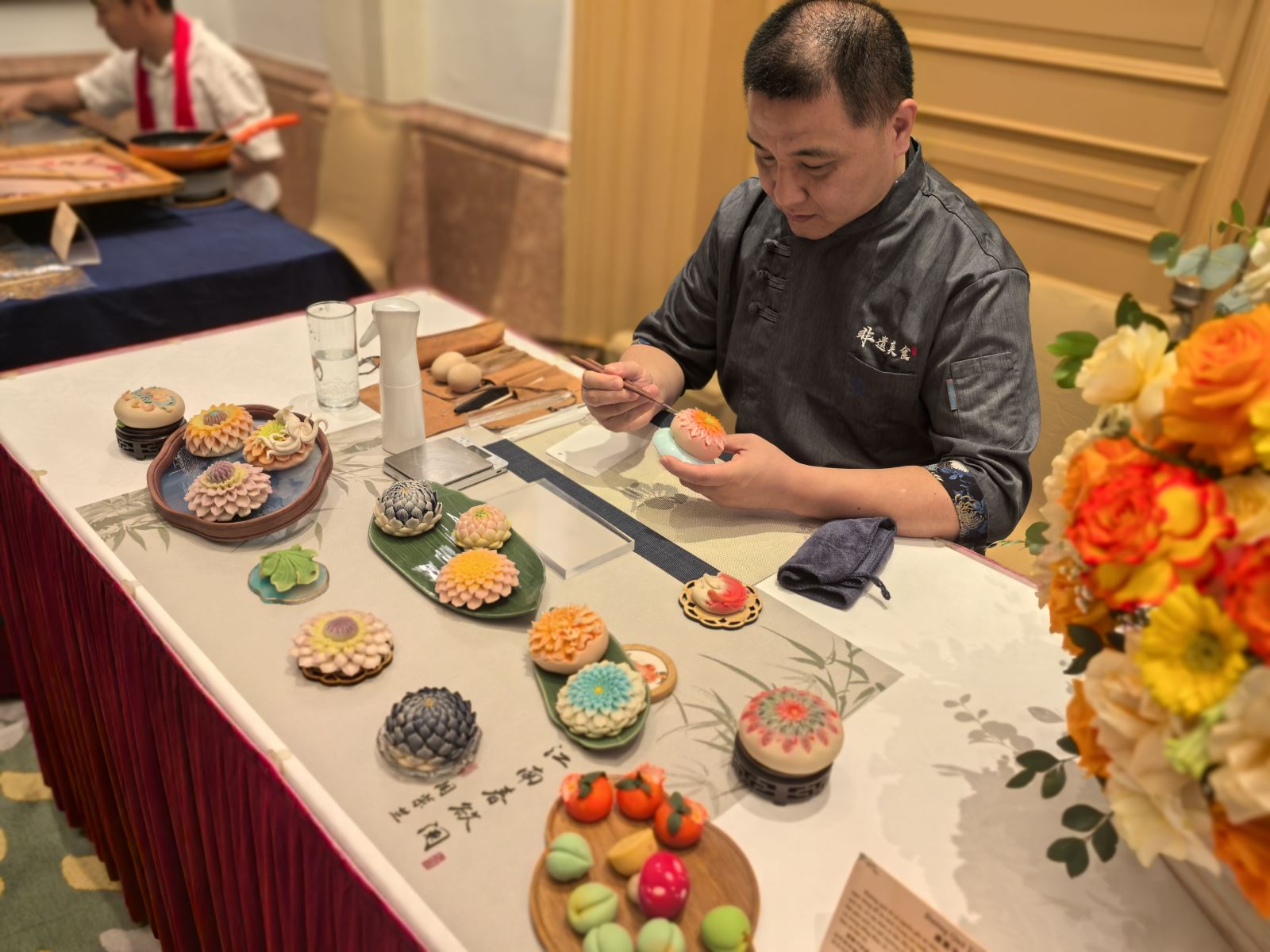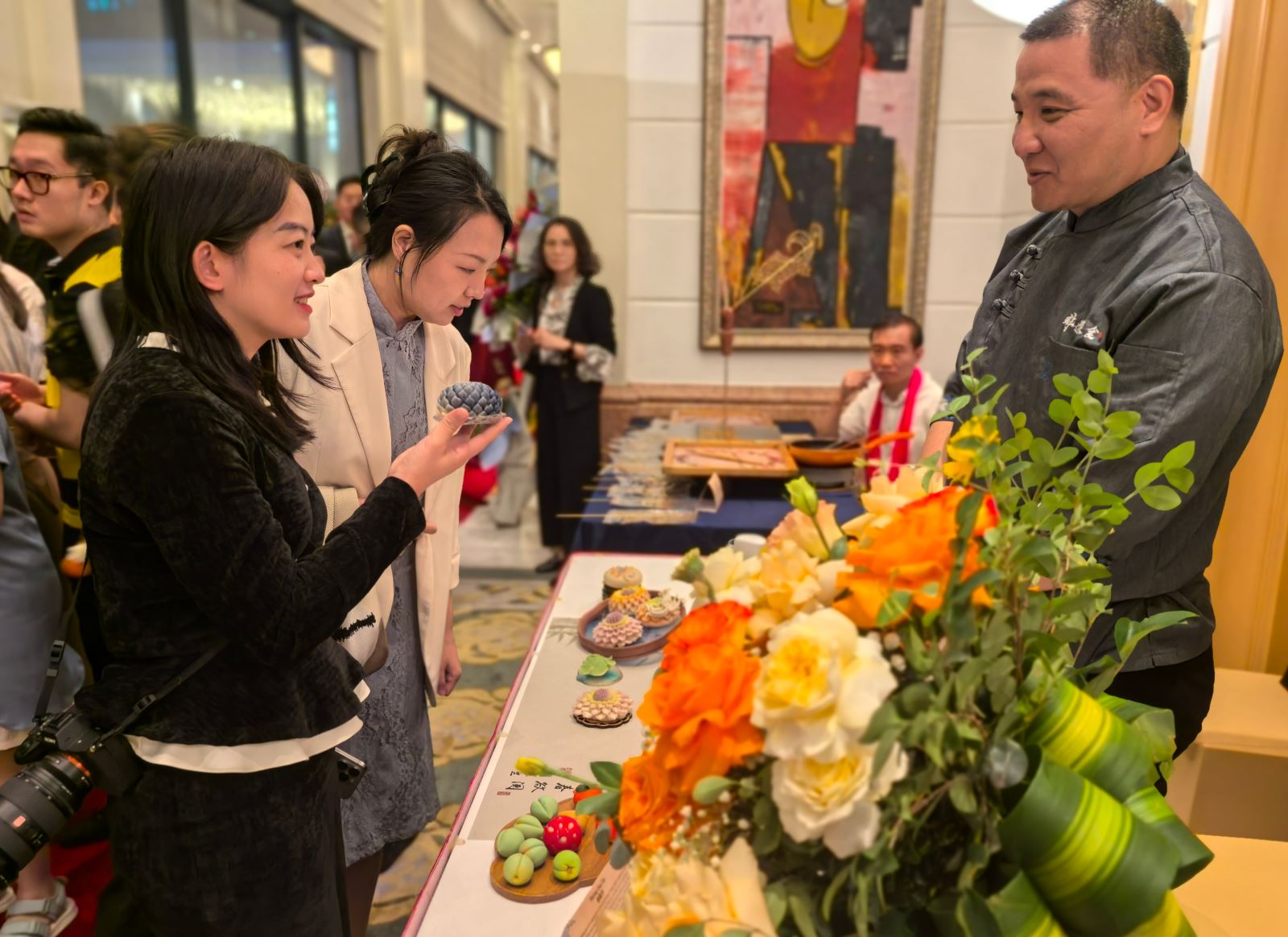 当晚,步入招待会入口处,走廊两侧的非遗糖画、糖菓子摊位尤为“吸睛”。糖画师傅以铜勺为笔,融糖为墨,手腕轻转间,花鸟虫鱼等各式图案便流淌于光洁的石板之上,晶莹剔透,栩栩如生,引得嘉宾们连连称奇。一旁的糖菓子匠人则运刀如笔,在温润的糖料上精雕细琢,顷刻间,一朵朵绽放的玫瑰、一枚枚饱满的寿桃便跃然掌上,温润的色泽、逼真的形态......一件件成品如匠心独运的艺术珍品,令人赏心悦目、馋涎欲滴。