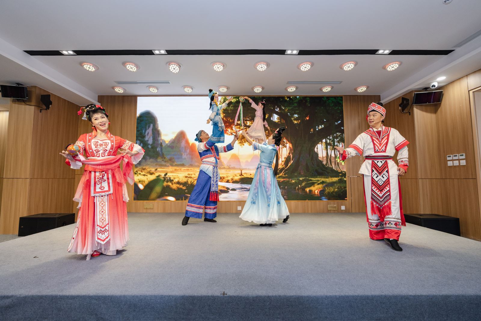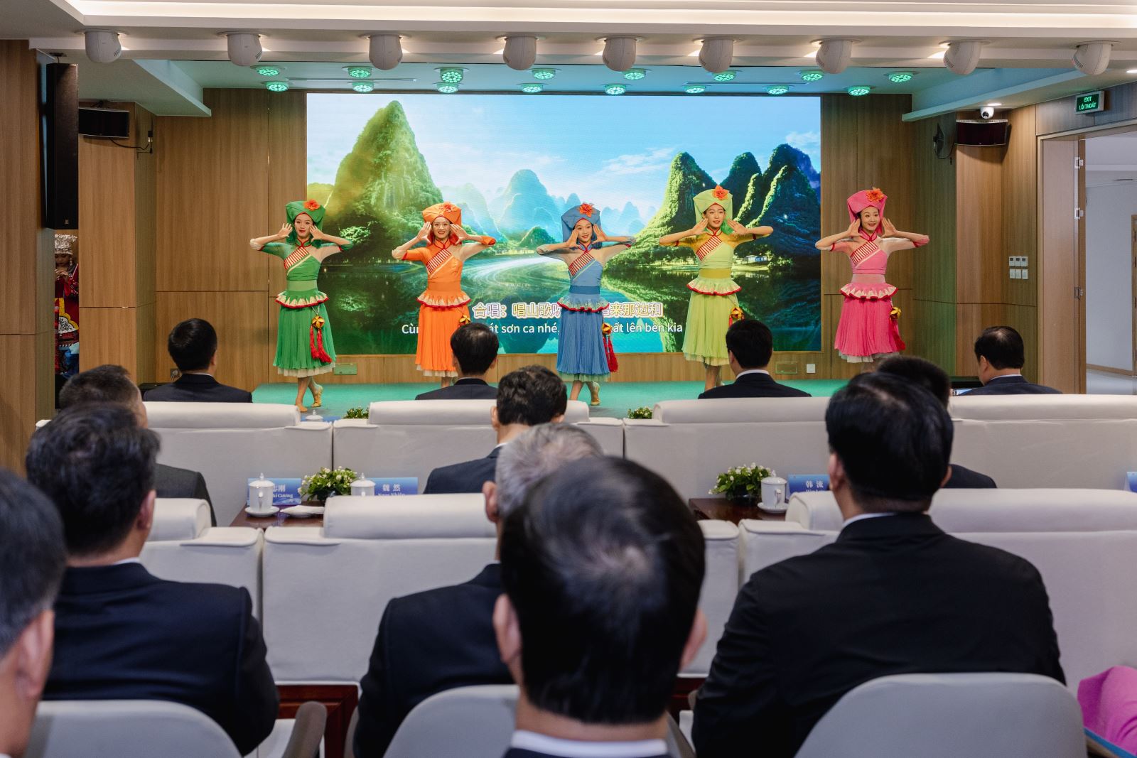 歌舞翩跹凝厚谊,声光织梦贯长虹。启动仪式在简约雅致的多功能厅举行,现场座无虚席,灯光温柔,气氛庄重而热烈。开场歌舞《山歌敬亲人》以清越的壮乡旋律为引,仿佛将万重青山、千条碧水凝于舞台,唱出“稻浪翻涌赠远客,江声和鸣寄深情”的淳厚心意;彩调剧与木偶《刘三姐》选段以诙谐生动的演绎,传递着跨越时空的智慧光芒,方寸舞台间,广西经典的“文化符号”体现得淋漓尽致;由中越歌手联袂献唱的《越南-中国》,以深情的和声,将睦邻友好的真挚情感推向高潮,引得全场击节相和,掌声雷动,心潮澎湃。