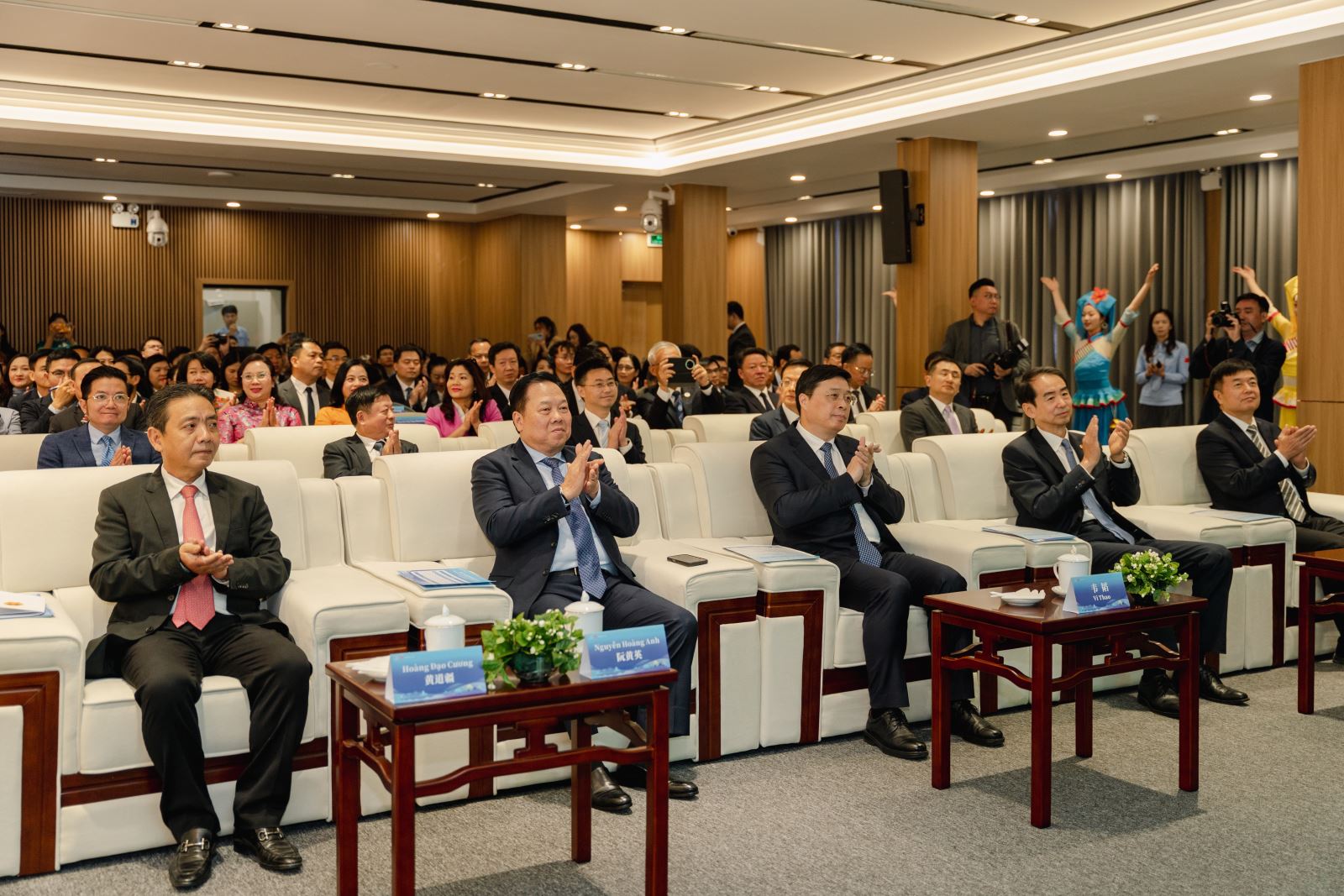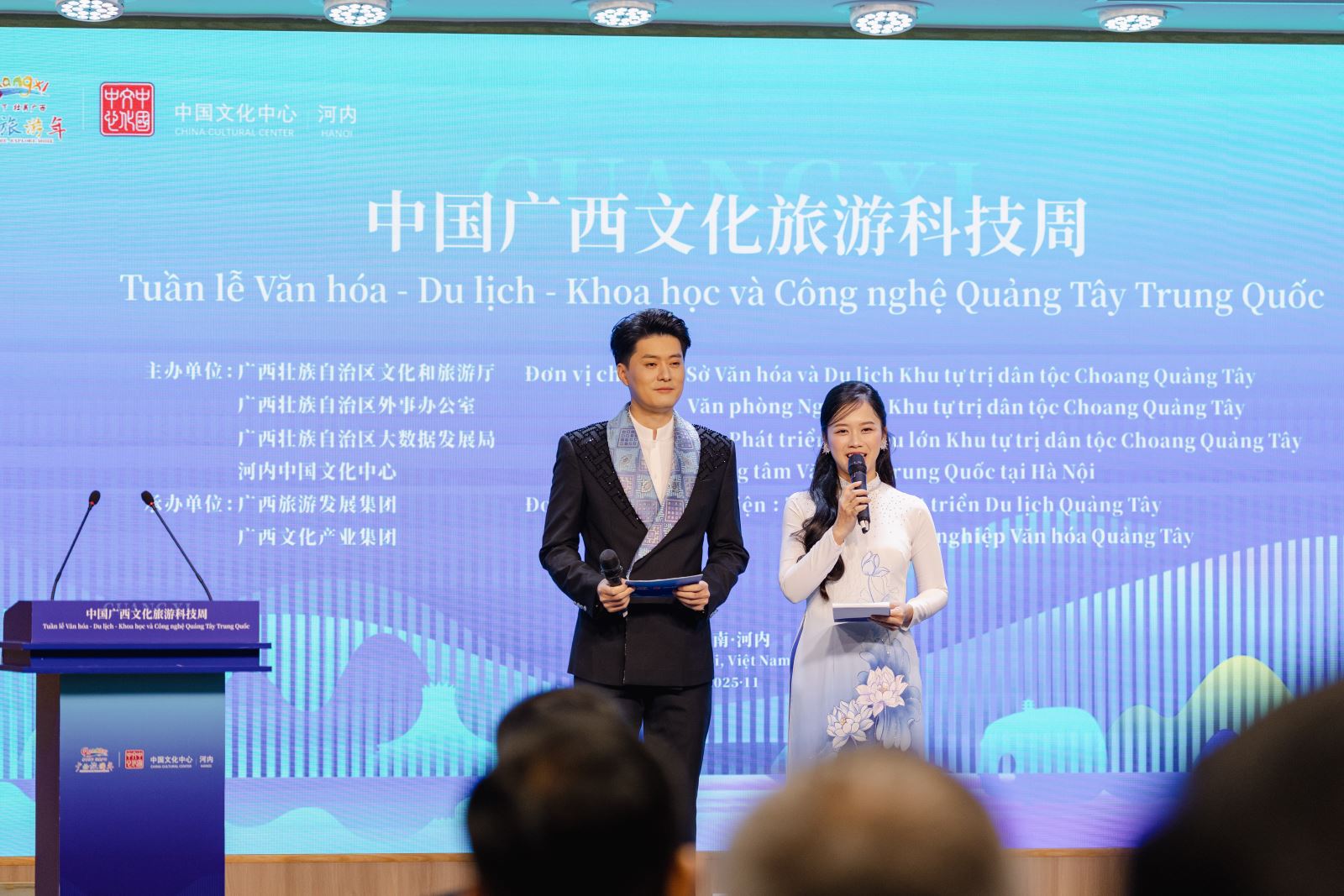 中共中央委员、广西壮族自治区主席韦韬,中国驻越南大使何炜,越共中央委员、中央战略政策部副部长、越中友协主席阮黄英,越南文化体育和旅游部副部长黄道疆,越南祖国阵线中央委员会副主席、越南文联主席杜红军,以及来自中越外交、文化、旅游、教育、新闻媒体等领域近200名代表欢聚一堂,共同聆听壮乡天籁的悠扬韵律,欣赏广西山水的诗意图景,触摸壮族织锦的千年温度,品味八桂美食的酸辣鲜香,感受中越友谊的绵长力量。
