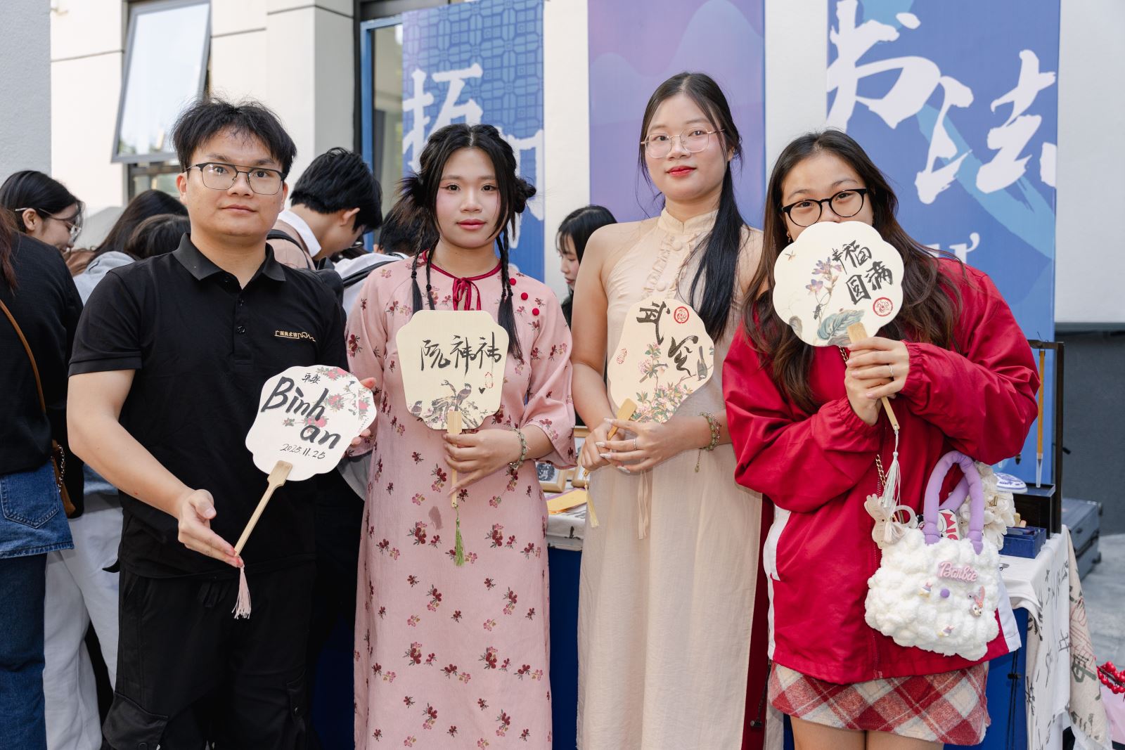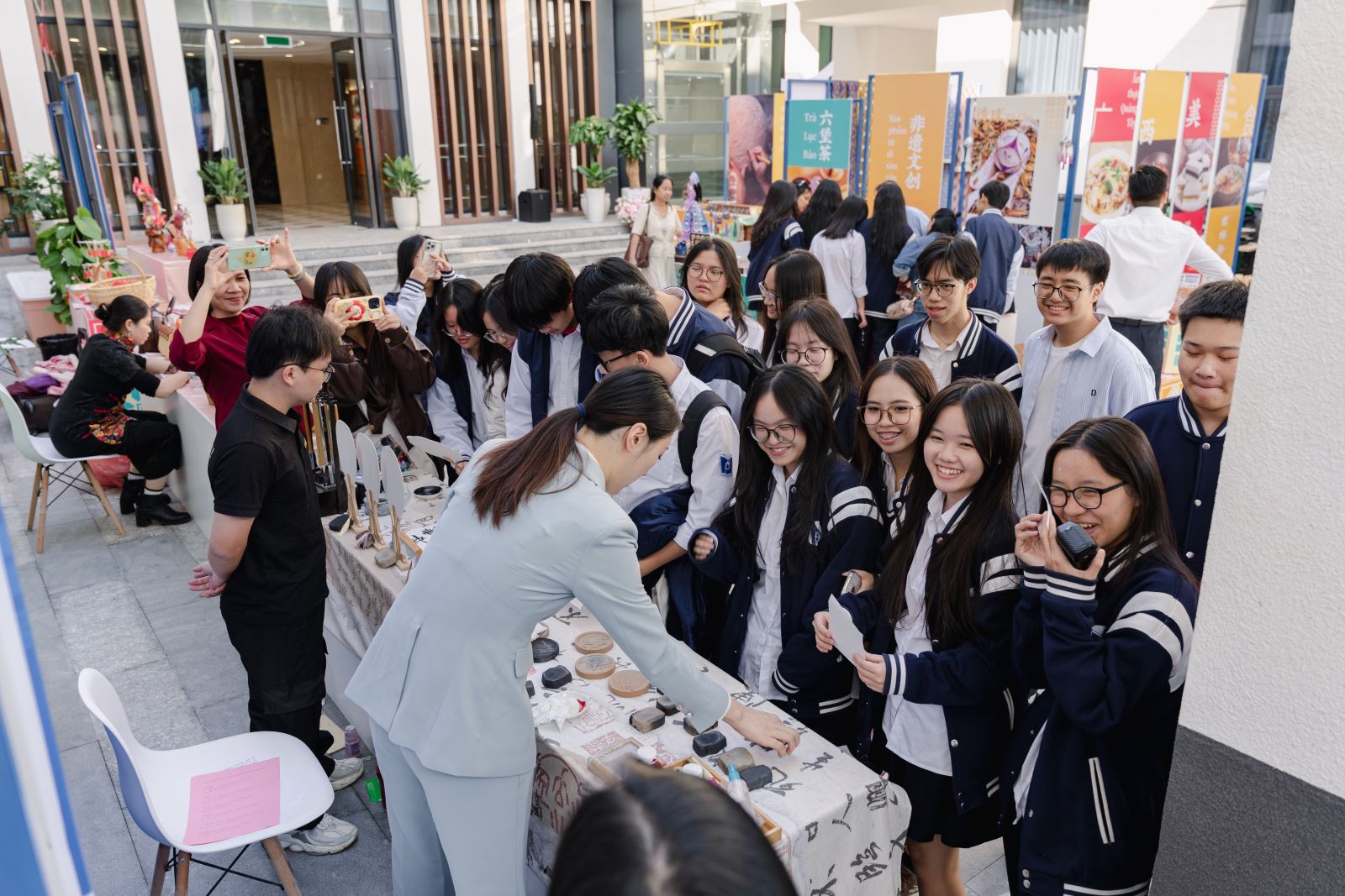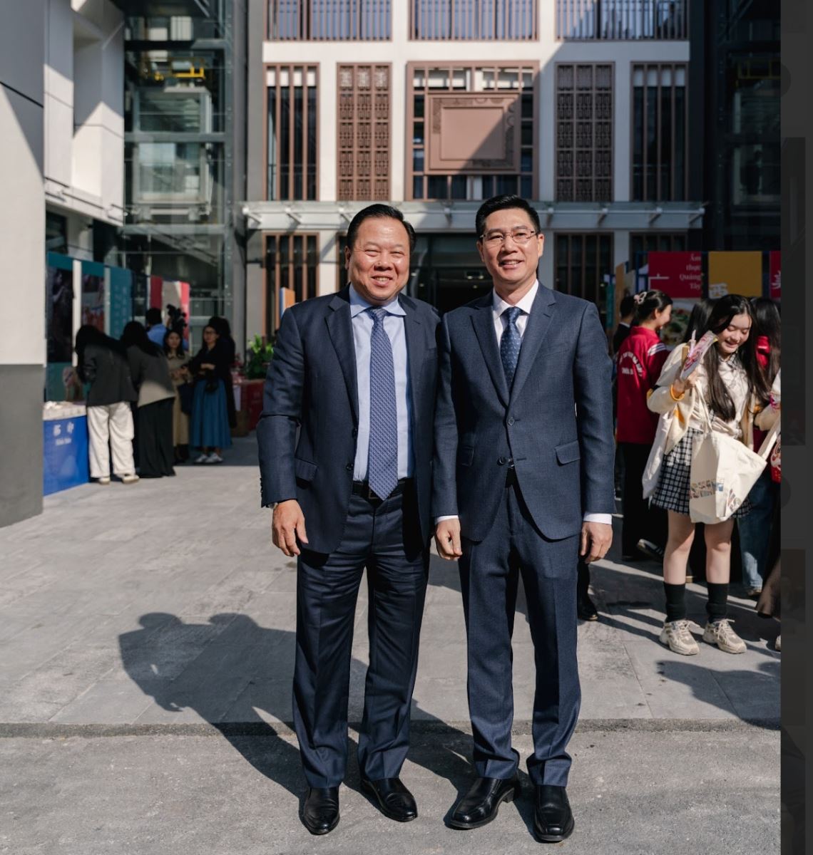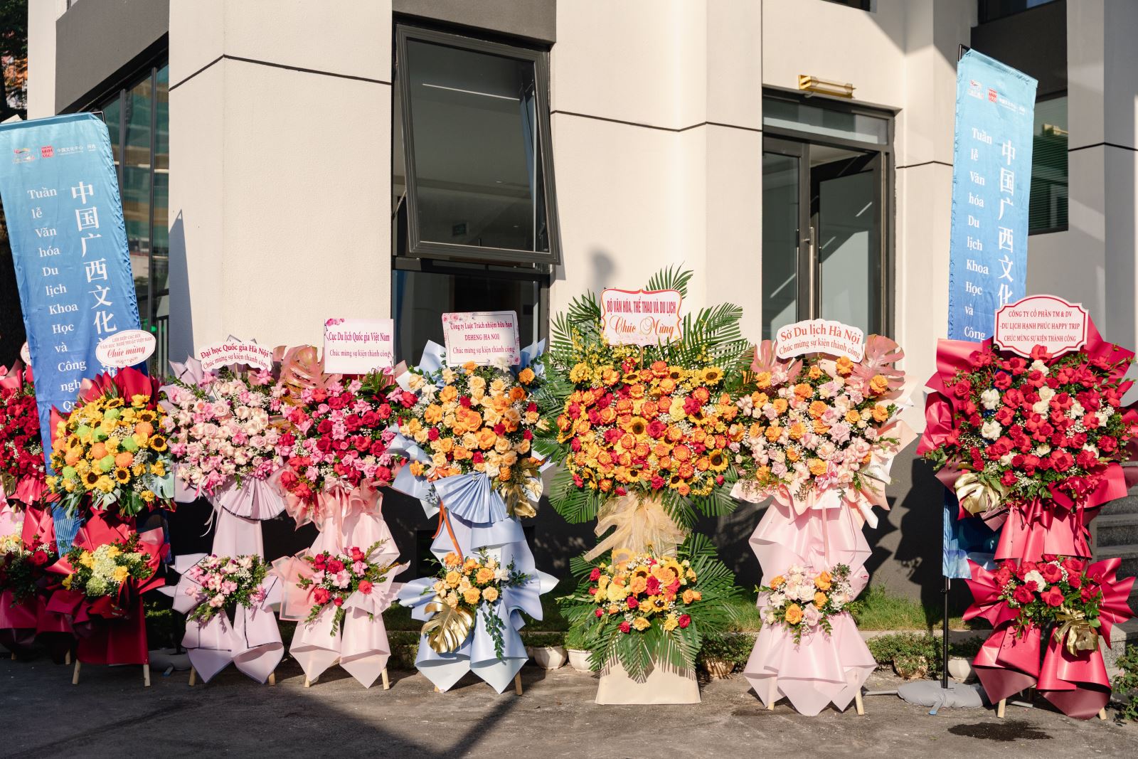 晴光潋滟映花影,暖意融融洽欢颜。当天上午,天朗气清,碧空如缎,阳光如织。河内中国文化中心院内,五星红旗迎风轻扬,似与晨光共舞,与蔚蓝天幕相映成辉。庭院入口处,越南文化、旅游、教育等部门和各界友好人士为预祝此次活动成功举办赠送的贺喜花篮整齐排列,缤纷花卉在暖阳浸润下宛若一道流动的锦绣长廊,仿佛为这场跨越国界的盛事铺就了一道绚丽天然的迎宾地毯。虽值初冬,现场却洋溢着如春的暖意与生机,令人心扉舒展。