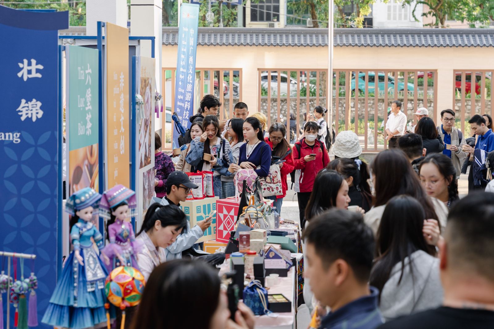 八时四十分左右,与会嘉宾们踏着光影陆续抵达。户外中庭区域的广西非遗展示区与“风味广西”美食品鉴区迅速成为焦点。古朴精巧的坭兴陶、晶莹似雪的贝雕、斑斓若霞的壮锦、匠心独运的剪纸、氤氲缭绕的六堡茶、酸辣醒神的老友粉、鲜香诱人的柠檬鸭......嘉宾们或俯身细赏剪纸的纤巧,或举杯慢品茶汤的醇厚,或举起手机,在拓印体验台前录下匠人示范操作的瞬间......人群熙攘,笑语盈盈,绘就了一幅“人在画中游,情在景中融”的生动图景。
