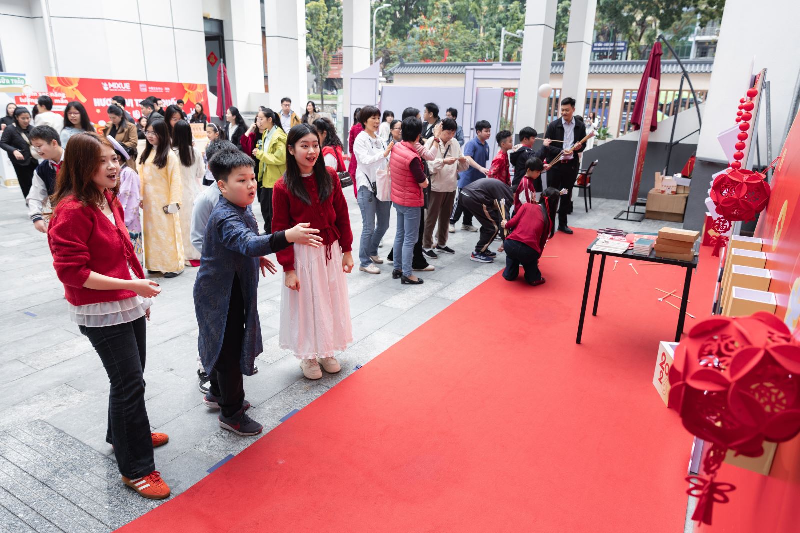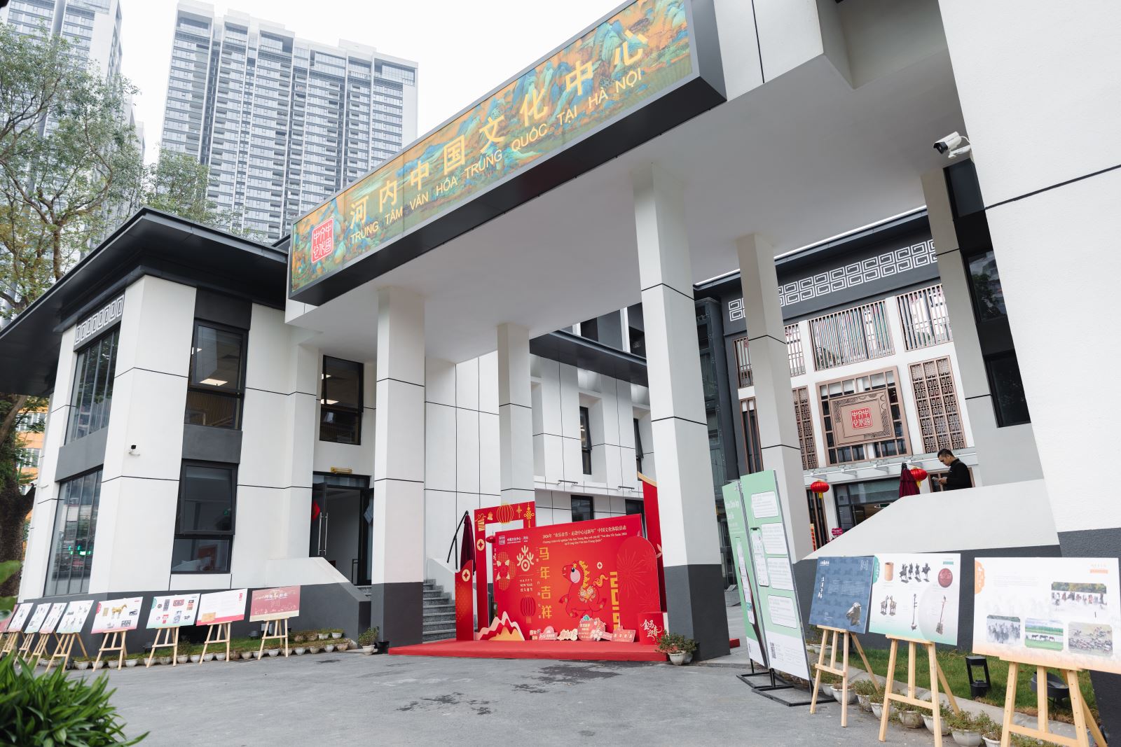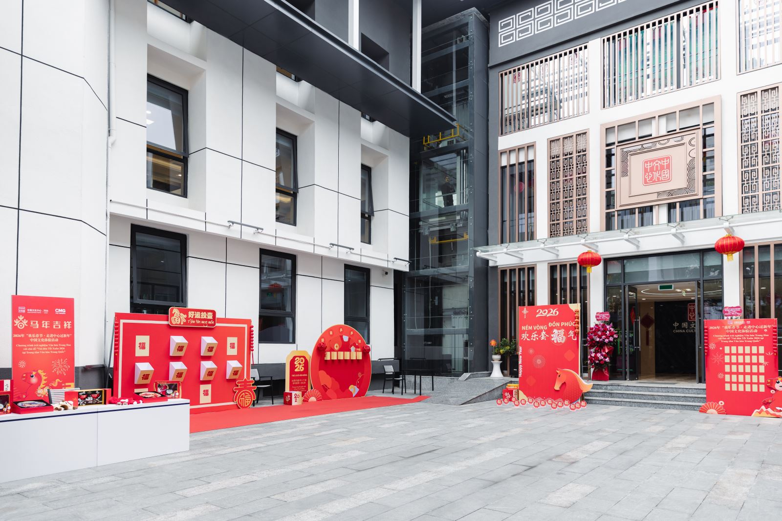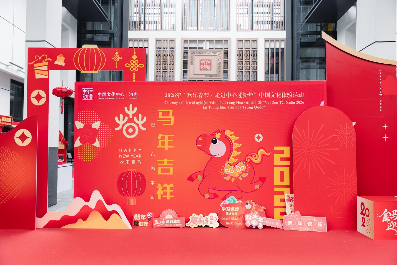 当天下午,河内中国文化中心院内张灯结彩、年意如织,午后暖阳映出人影憧憧、笑语盈盈的喜庆氛围。步入中心庭院,热烈而典雅的中国红映入眼帘,恍若踏入一场穿越时空的新春雅集。中国结、红灯笼、中式窗花、金桔树......年节物象俯拾皆是。庭院两侧,“你好!中国”APP与“马舞新春——丙午马年全球生肖文化大联展”主题宣介图片阵列而立,错落如屏。骏马昂首、蹄下生风的视觉意向与现场节日氛围相映成趣,一步一景,皆是岁时之礼,铺开一幅东方美学的迎春图卷。