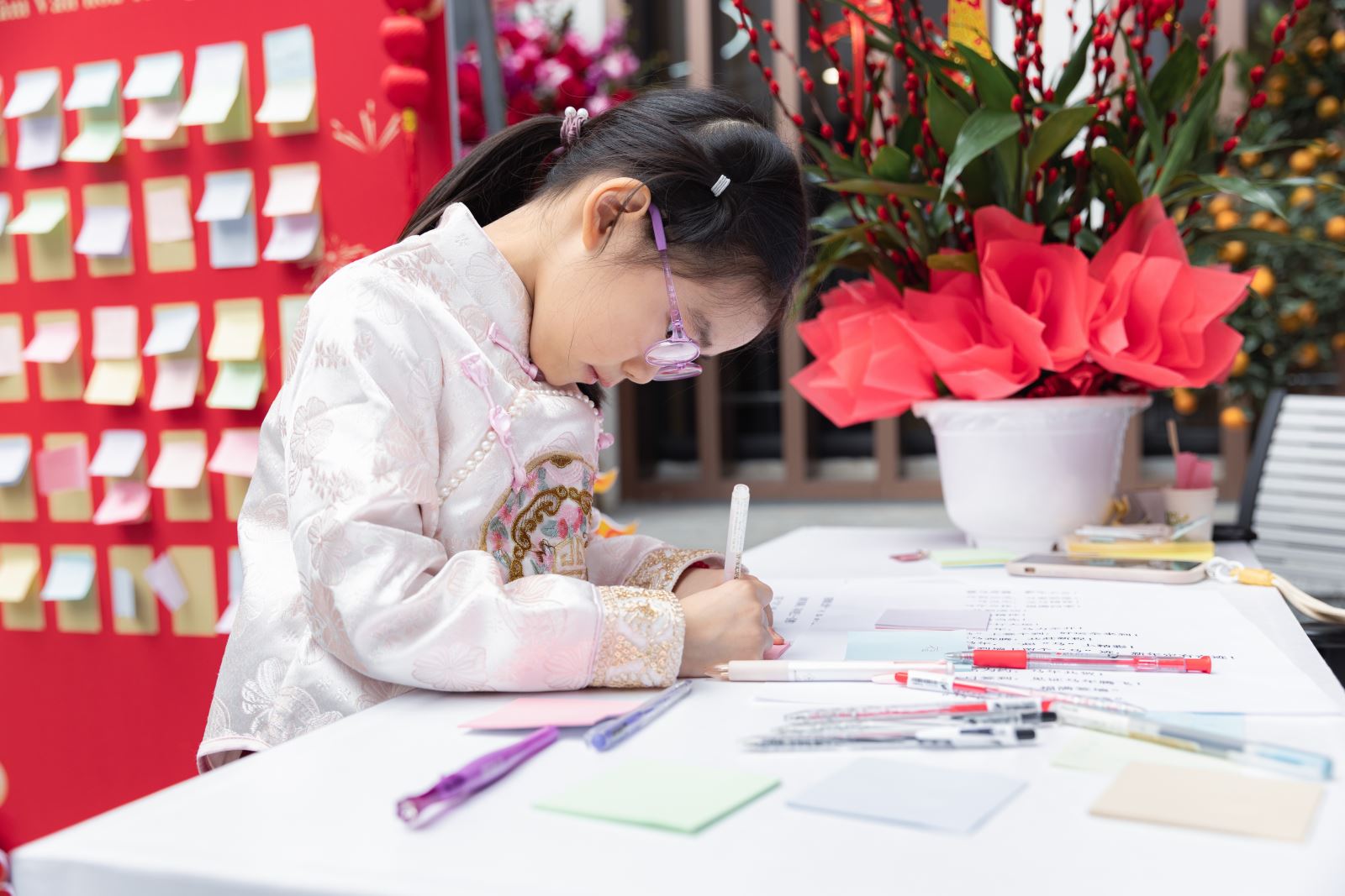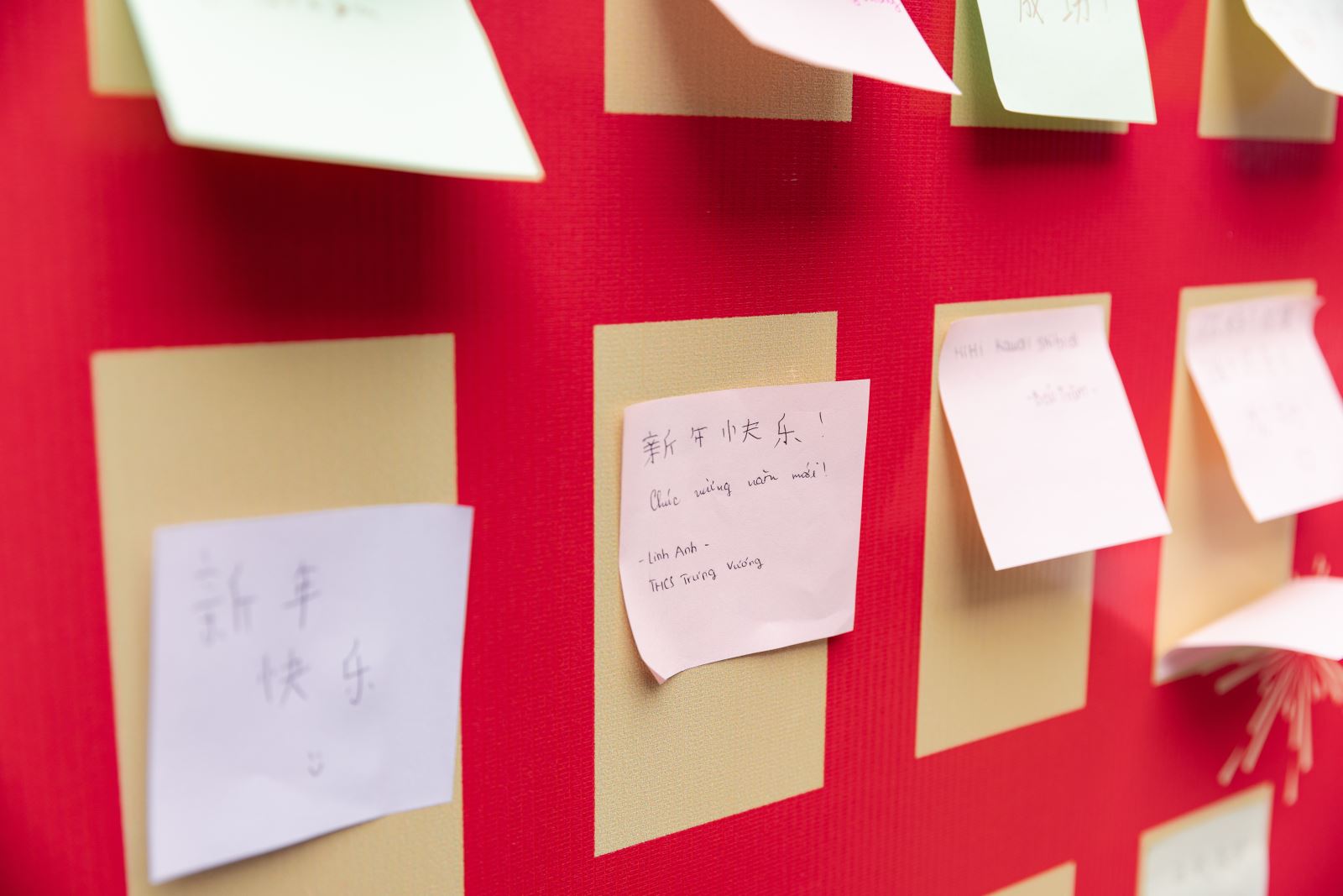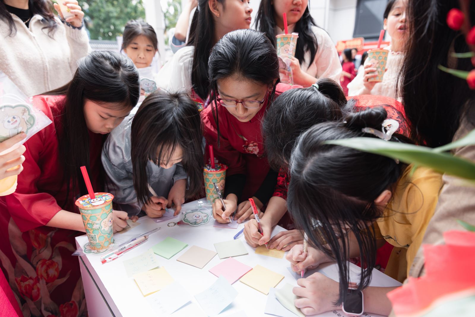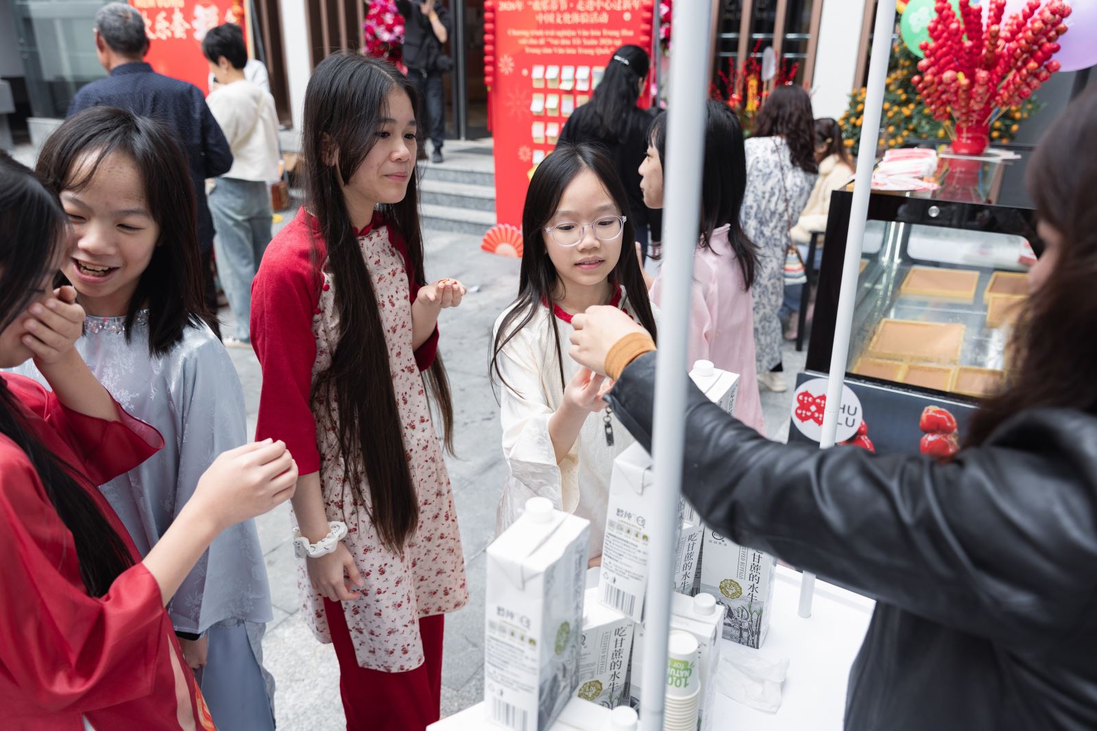 最为热闹的是有奖互动游戏区。“好运投壶”游戏区前,小朋友们凝神屏息,手持竹箭,目光专注如射者临靶,当一掷中的,周围掌声顿起。失之毫厘者亦不气馁,再试再战,颇有古时射礼遗风。“幸运乒乓球”游戏区,孩子们俯身探手,既盼又怯,球落杯中刹那,围观人群欢声四起。“欢乐套‘福’气”游戏则以“福”字为靶,最受低龄孩童青睐。圆环在空中划出弧线,套中“福”字瞬间,孩子们激动得踮脚雀跃,双手高举小奖品向同伴炫耀,肉眼可见的欢喜溢于言表。游园区一隅,马年新春祝福“留言墙”亦是一道亮丽风景。留言墙上,中越孩童以稚拙汉字写下祝福:“新年快乐”“一马当先”“幸福快乐”。字迹或歪斜,笔画或疏漏,却一笔一画郑重其事,如初学衔泥的春燕。有孩子画下一匹小马,有人描了红彤彤的灯笼,旁缀爱心三两颗。童言天真,文字与图像皆是中越青少年们心照不宣的岁初问候,令人动容。“中国味道”美食品鉴区亦人潮如织,“悠纯”水牛奶入口如丝绒轻覆舌尖、蜜雪冰城茶饮清冽沁脾、冰糖葫芦赤红透亮......年味化为舌尖甘醇,与现场欢声笑语融成一片。