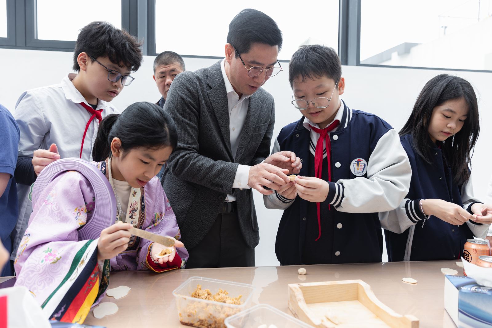 观影结束后,众人移步三楼美食互动体验区体验包饺子等中国年俗。孩子们洗净小手,跃跃欲试。“除夕夜吃饺子,取‘更岁交子’之意,也象征团圆和福气。”孩子们边听边学,有的面粉沾上鼻尖,须臾间化作“白鼻小狸”;有的皮擀得歪扭如叶,索性笑称“这是芭蕉叶形饺”;有的填馅过满,一捏合便“笑”开了口,馅料探头探脑。现场无人气馁,亦无苛责。厨师俯身执手,耐心点拨:“掌心稍微弯一些,对折先捏中,再收两边。”不多时,饺子渐渐成形:月牙形、小包袱形、花朵形……虽不规整,却各具稚趣。当饺子出锅,孩子们争先举筷,咬破薄皮,汁水盈口,“好吃!我还要!”现场洋溢着美味与欢乐气氛。