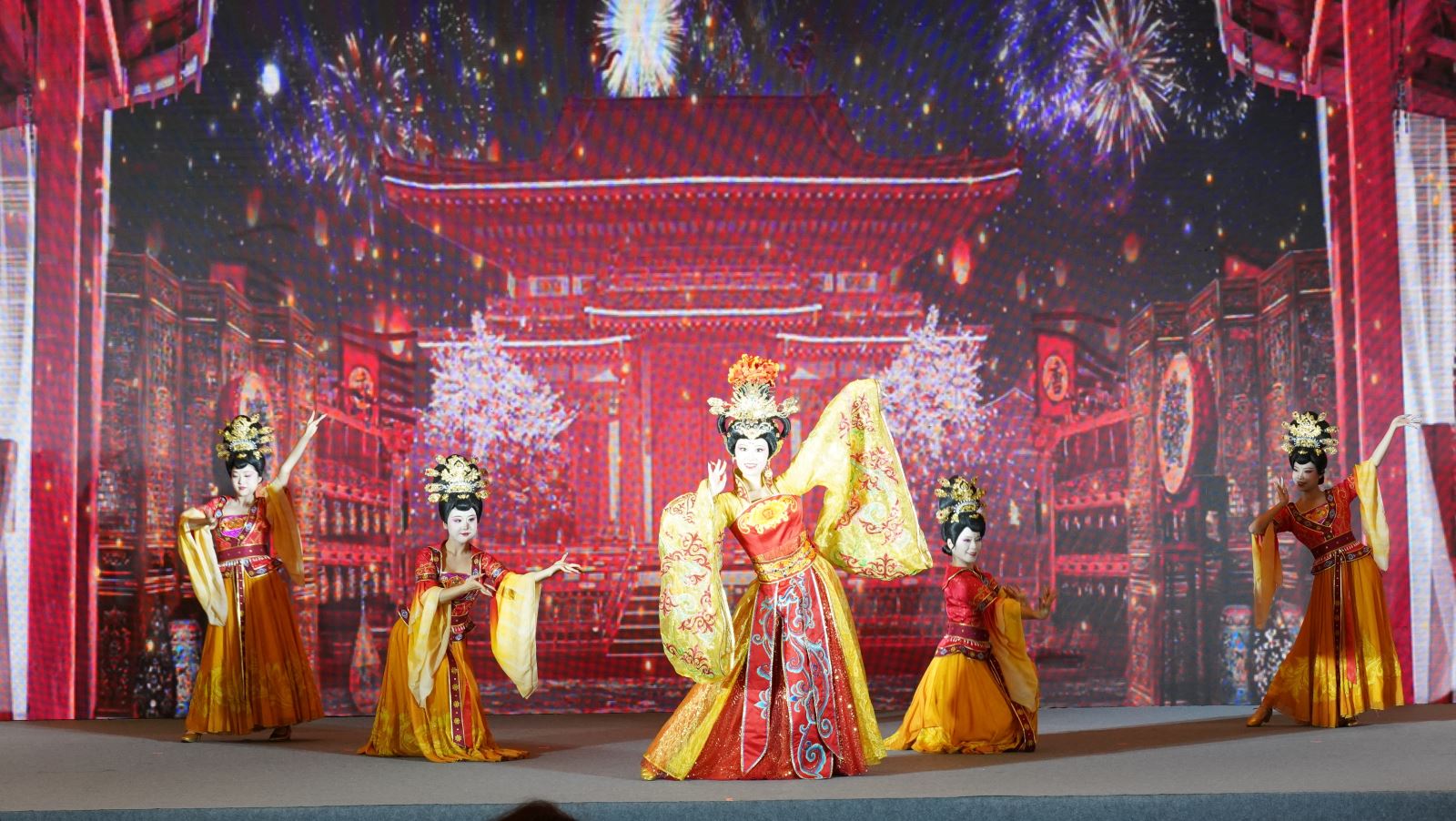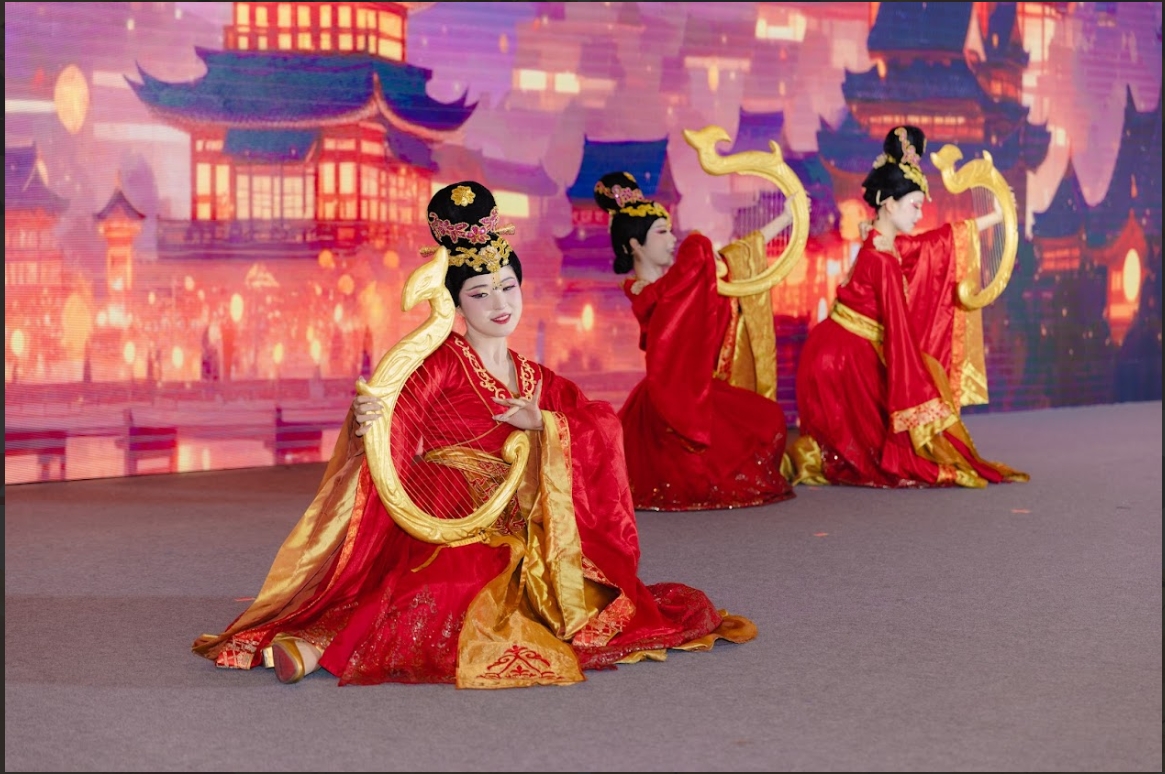 推介会在一场绚丽如梦的《霓裳羽衣舞》中优雅启幕。舞者身着层叠飘逸的彩衣,随着盛唐遗韵翩跹起舞,金线银丝在灯影下熠熠生辉,云袖翻飞间,仿佛敦煌壁画中的飞天仙子翩然而降,又似古卷轴里的宫廷佳人踏歌而来。每一个回眸顾盼,每一次履尖轻点,都牵引着现场观众的心神,瞬间坠入千年长安那场繁华似锦、笙歌不歇的盛世华梦。未及梦醒,随之而来的舞蹈《大唐华章》更以磅礴的乐声、恢弘的编排和璀璨的服饰,再现万国来朝、丝路交响的大气象,一举一动间尽显雍容典雅,引得现场掌声如潮、气氛炽热。
