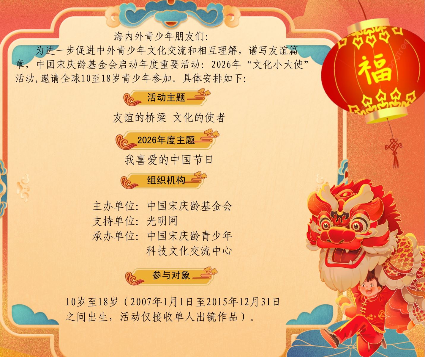 为进一步促进中外青少年文化交流和相互理解,谱写友谊篇章,中国宋庆龄基金会启动年度重要活动:2026年“文化小大使”活动,邀请全球10至18岁青少年参加。具体安排如下: