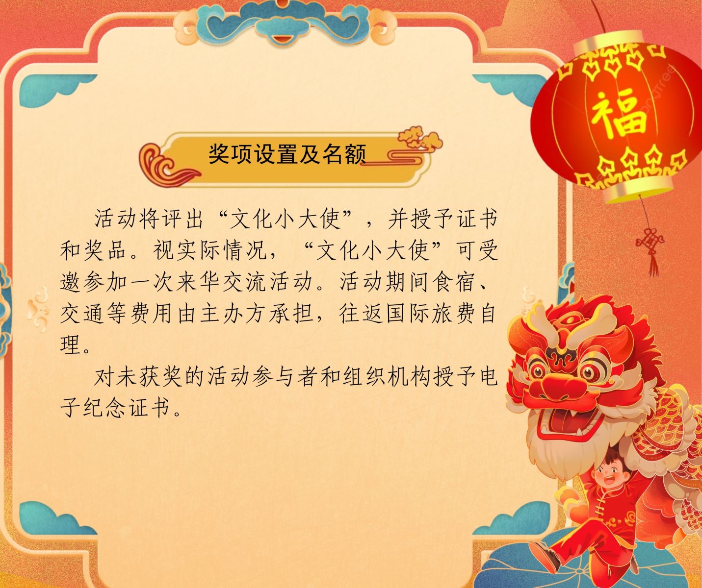活动将评出“文化小大使”,并授予证书和奖品。视实际情况,“文化小大使”可受邀参加一次来华交流活动。活动期间食宿、交通等费用由主办方承担,往返国际旅费自理。