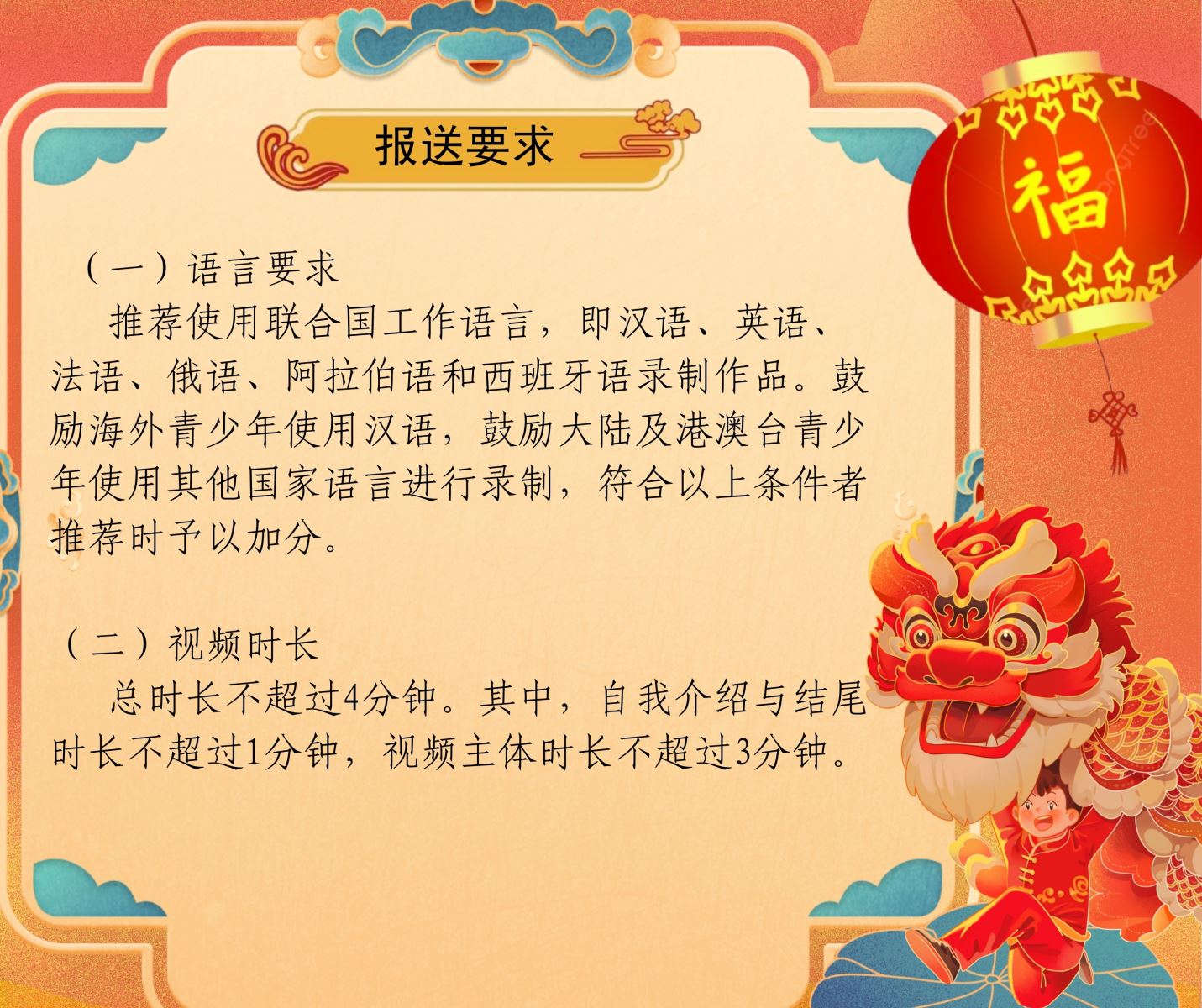 推荐使用联合国工作语言,即汉语、英语、法语、俄语、阿拉伯语和西班牙语录制作品。鼓励海外青少年使用汉语,鼓励大陆及港澳台青少年使用其他国家语言进行录制,符合以上条件者推荐时予以加分。
