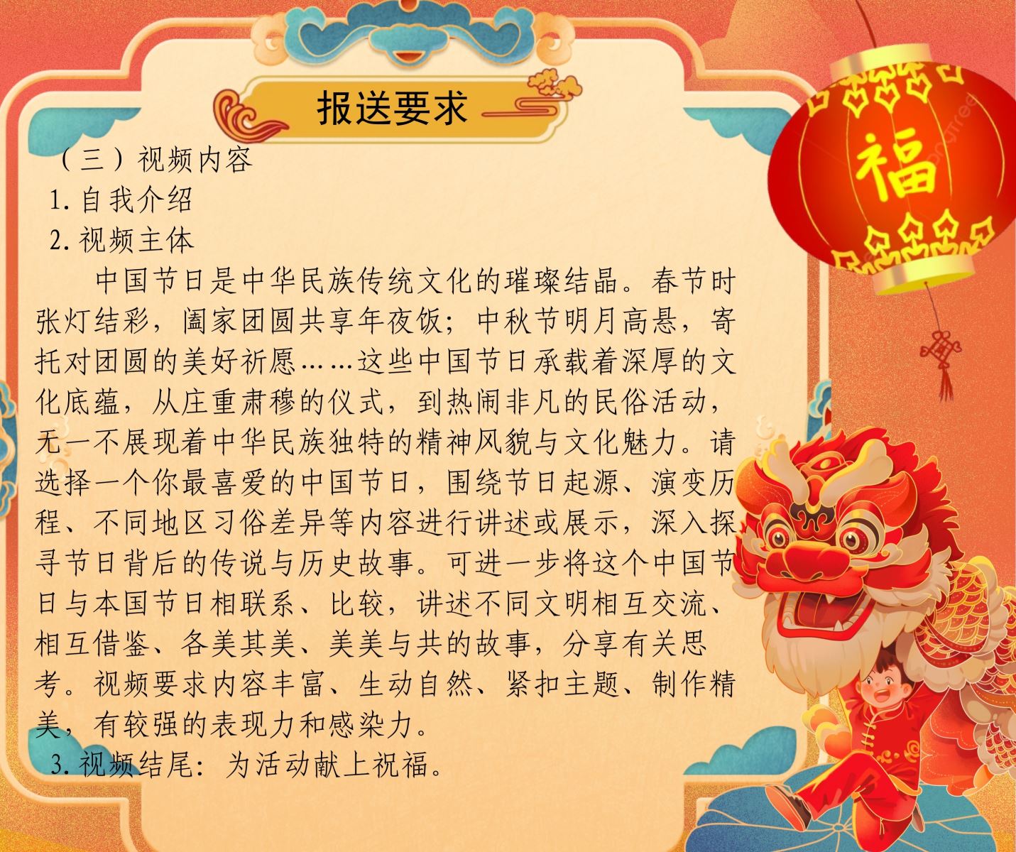 中国节日是中华民族传统文化的璀璨结晶。春节时张灯结彩,阖家团圆共享年夜饭;中秋节明月高悬,寄托对团圆的美好祈愿……这些中国节日承载着深厚的文化底蕴,从庄重肃穆的仪式,到热闹非凡的民俗活动,无一不展现着中华民族独特的精神风貌与文化魅力。请选择一个你最喜爱的中国节日,围绕节日起源、演变历程、不同地区习俗差异等内容进行讲述或展示,深入探寻节日背后的传说与历史故事。可进一步将这个中国节日与本国节日相联系、比较,讲述不同文明相互交流、相互借鉴、各美其美、美美与共的故事,分享有关思考。视频要求内容丰富、生动自然、紧扣主题、制作精美,有较强的表现力和感染力。