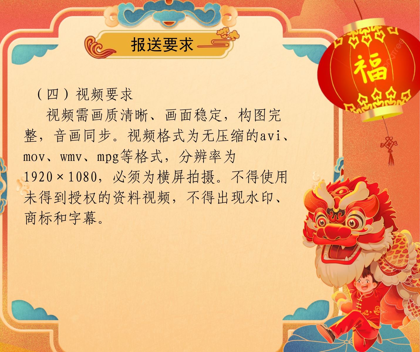 视频需画质清晰、画面稳定,构图完整,音画同步。视频格式为无压缩的avi、mov、wmv、mpg等格式,分辨率为1920×1080,必须为横屏拍摄。不得使用未得到授权的资料视频,不得出现水印、商标和字幕。
