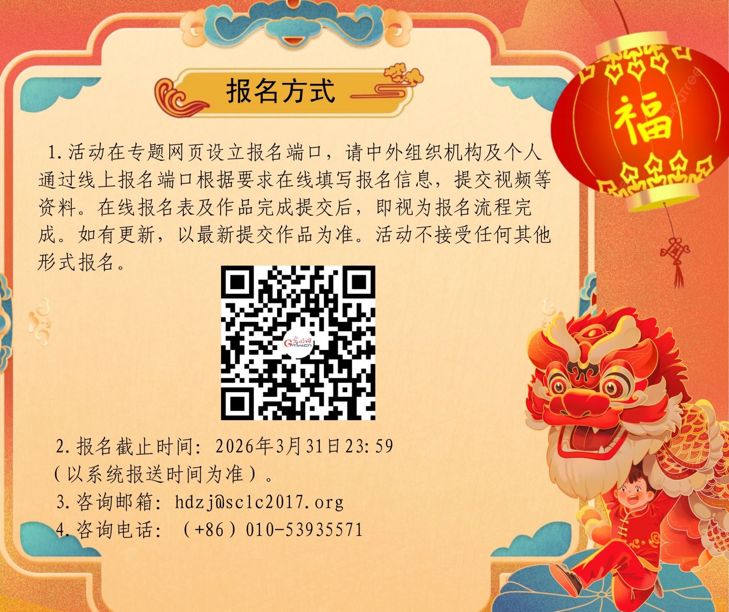 1. 活动在专题网页设立报名端口,请中外组织机构及个人通过线上报名端口根据要求在线填写报名信息,提交视频等资料。在线报名表及作品完成提交后,即视为报名流程完成。如有更新,以最新提交作品为准。活动不接受任何其他形式报名。