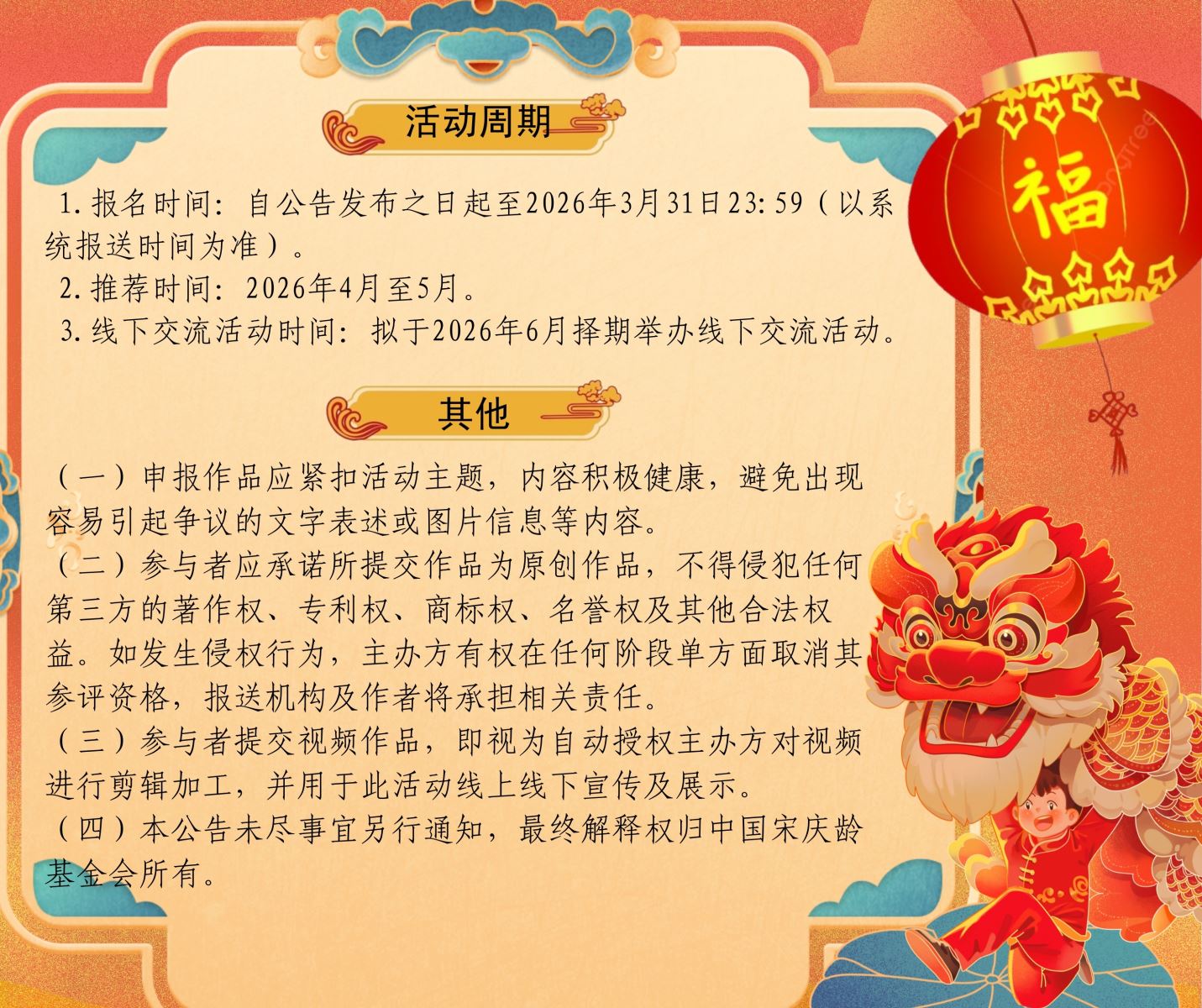 (四)本公告未尽事宜另行通知,最终解释权归中国宋庆龄基金会所有。
